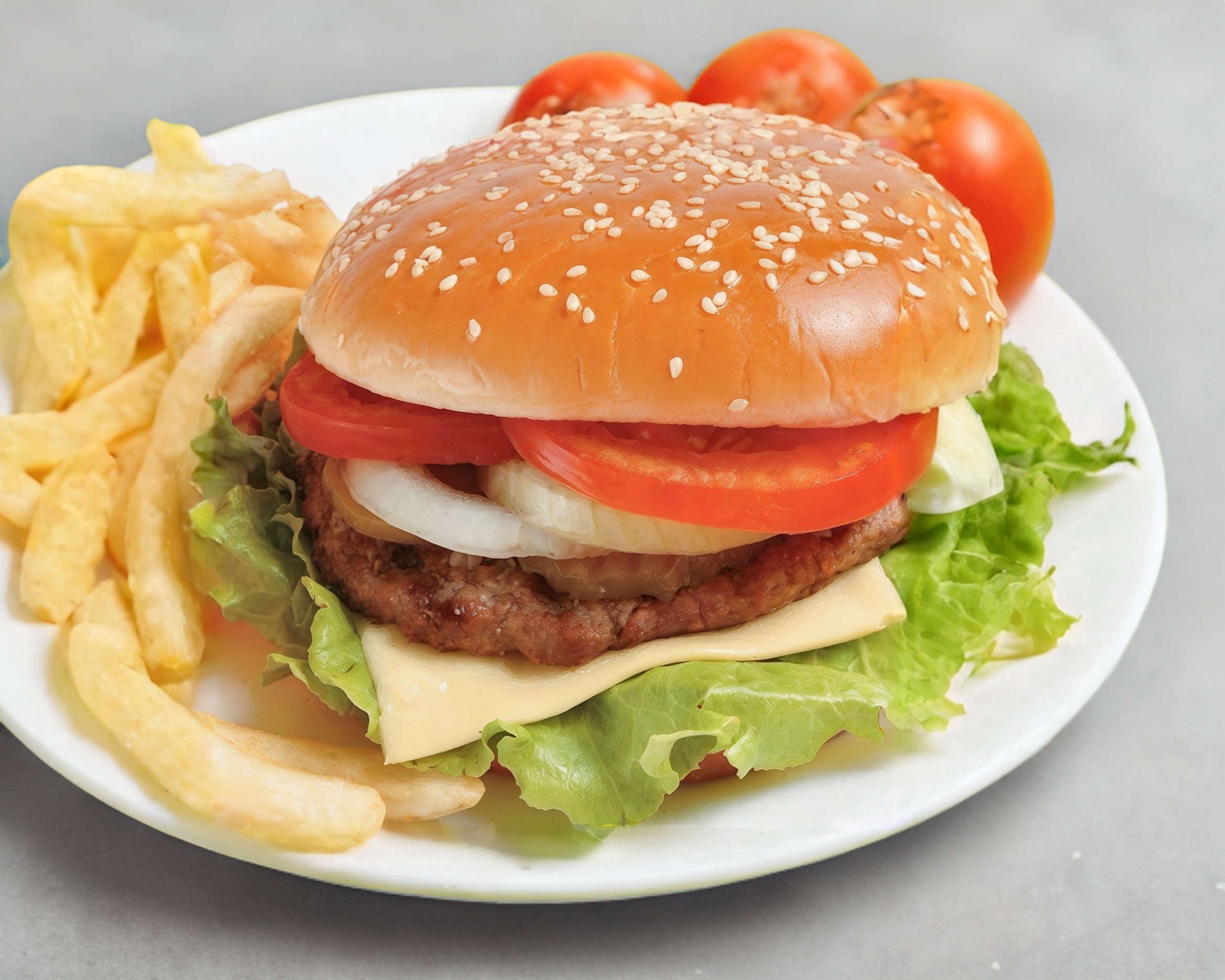 200 gr Papas a la Francesa + Hamburguesa de Res Grande ( 125 gr carne,mayonesa jitomate,cebolla,lechuga,queso amarillo,pepinillos, aguacate, capsu y mostaza)