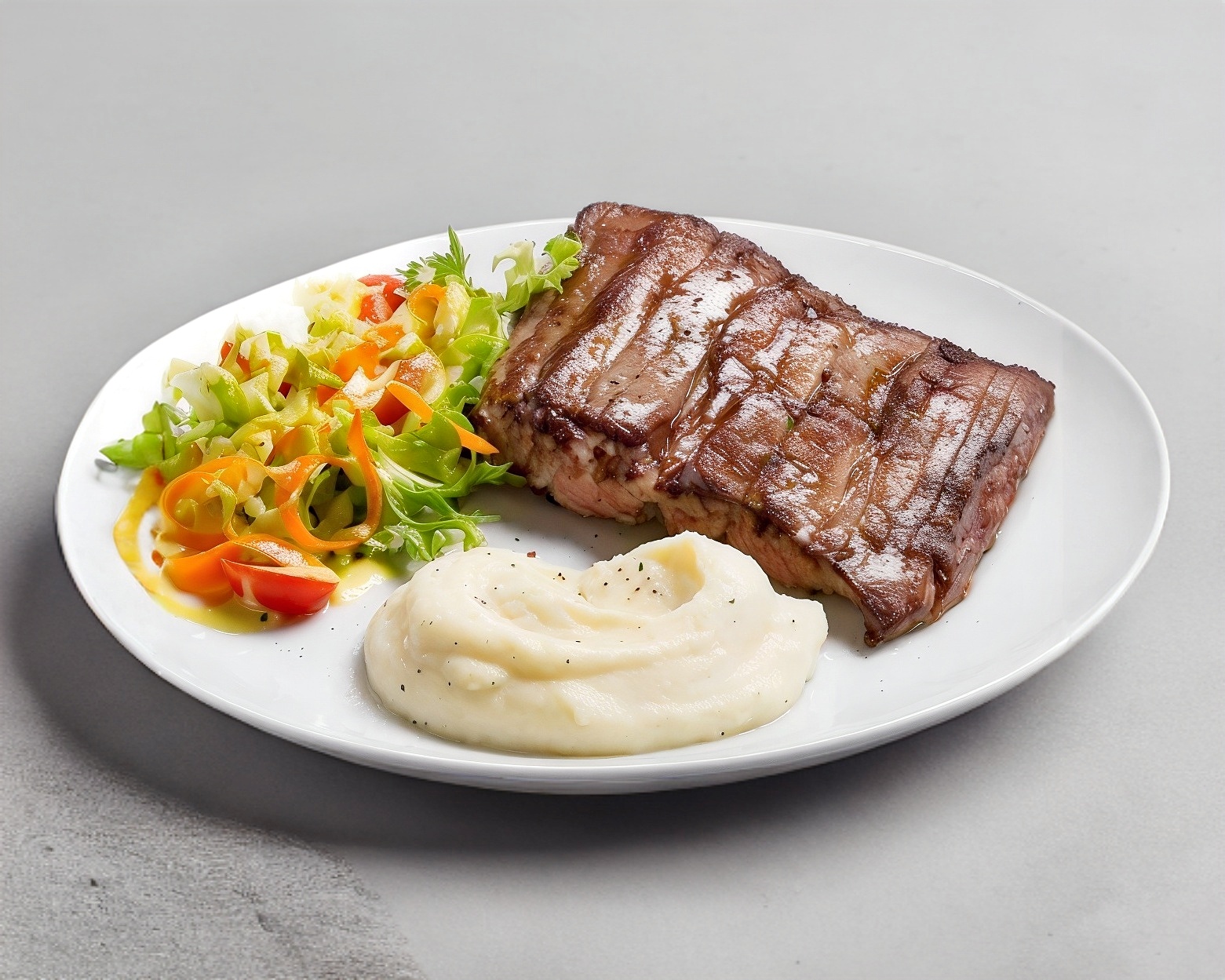 acompañada de pure de papa y ensalda, con un pedazo de carne (cruda250gr)