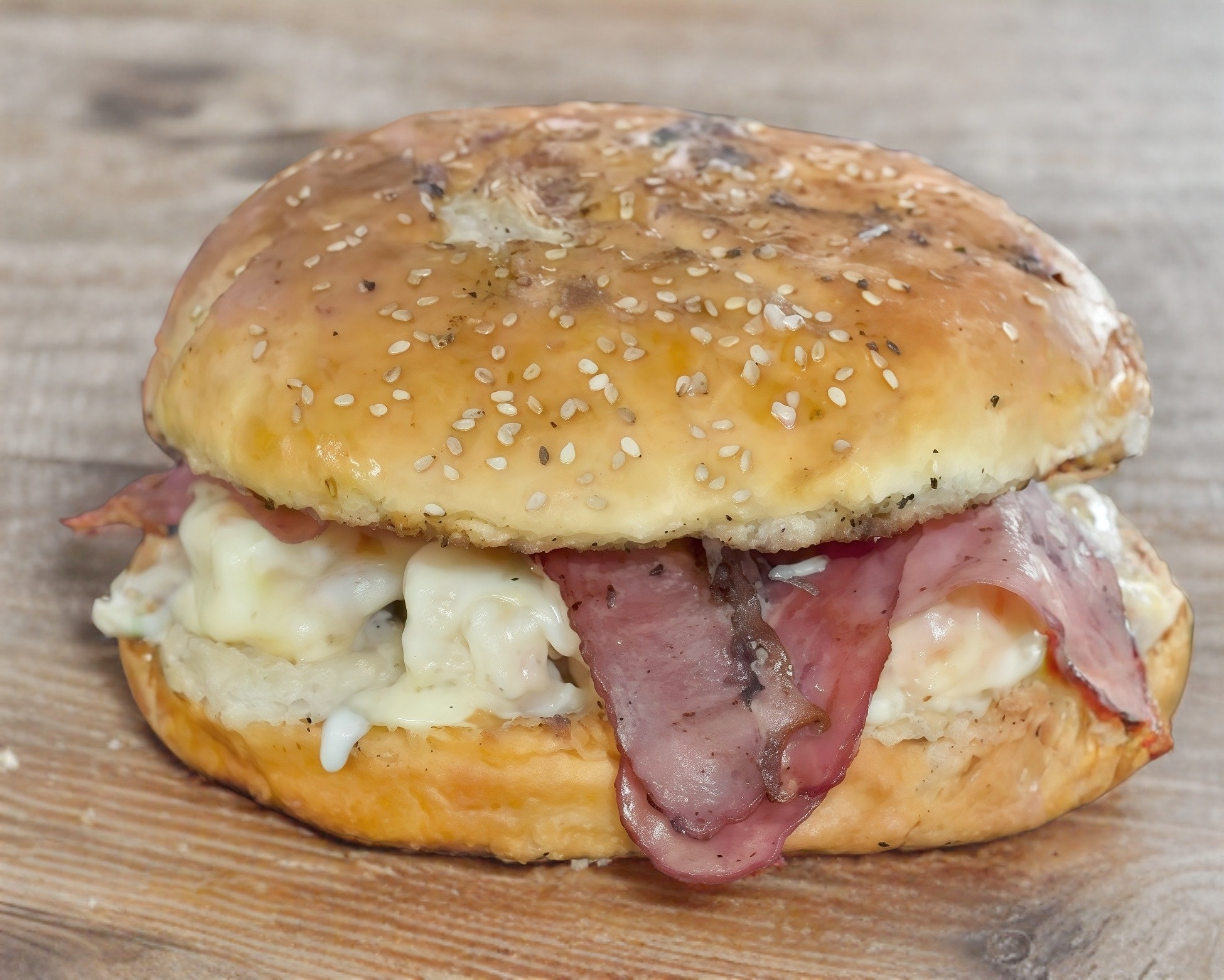 Pan artesanal. Piña, jamón, tocino y carne 100% de res.