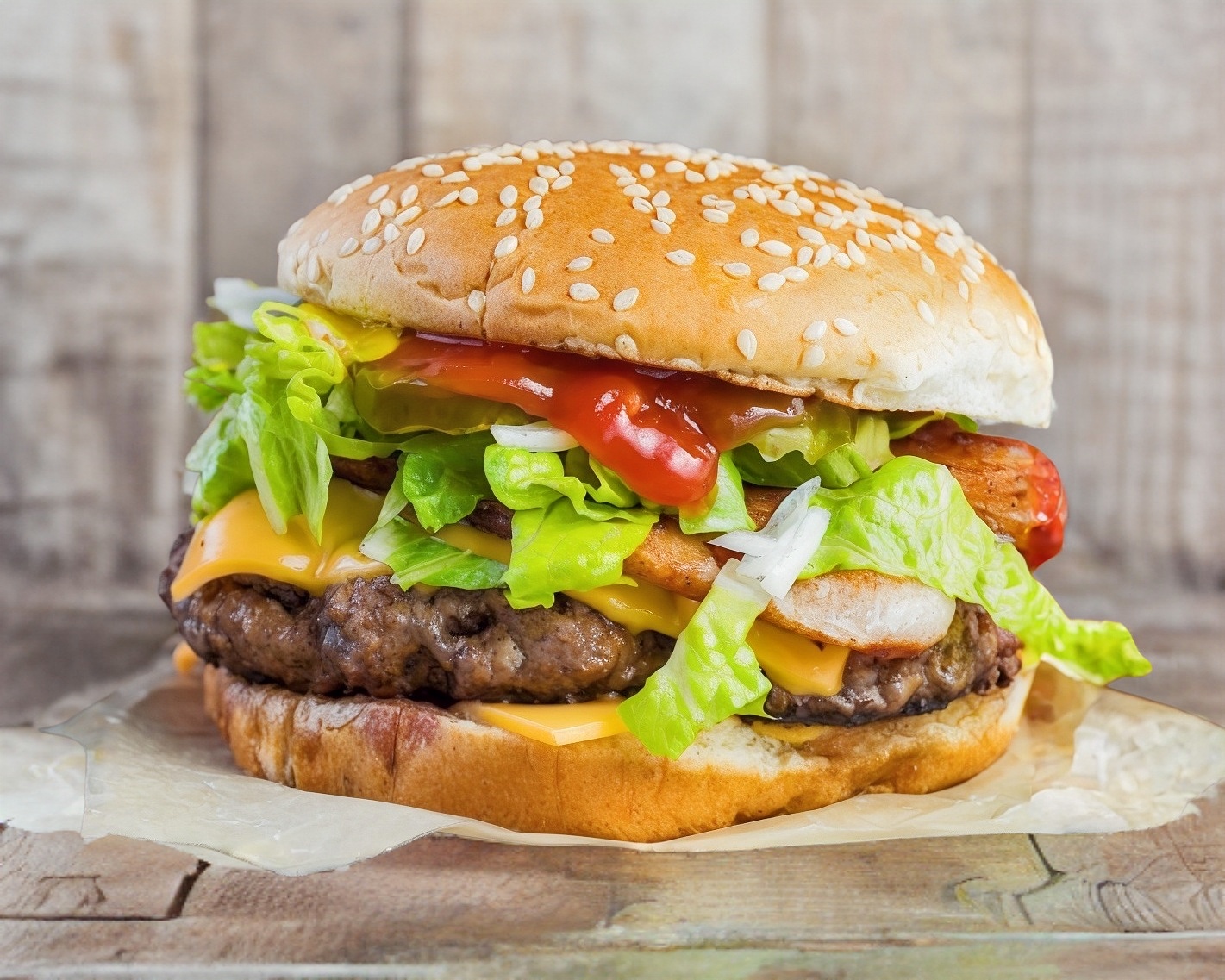Doble carne de res, BBQ,doble queso amarillo, verdura, capsu,mayonesa,crema y mostaza.