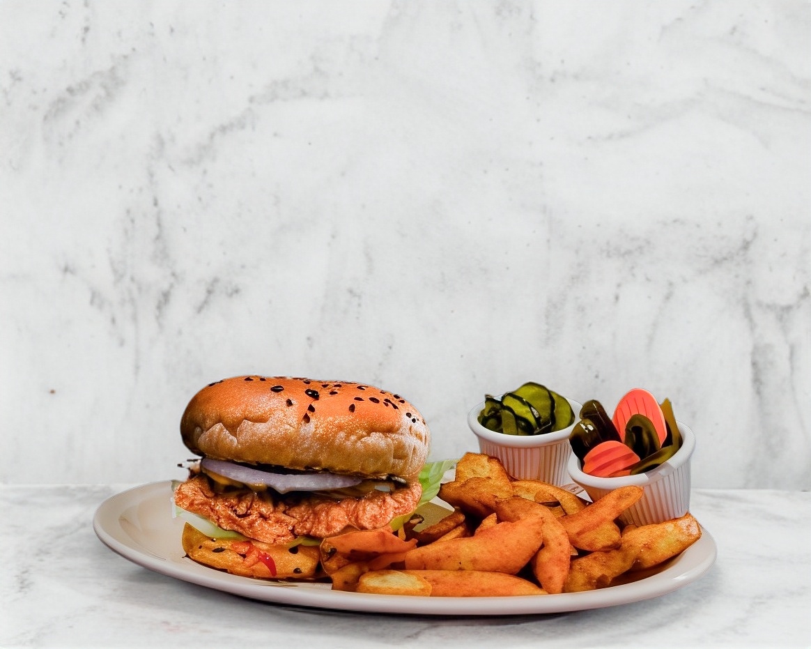 Deliciosa hamburguesa con pechuga de pollo crispy, queso manchego, jitomate, cebolla morada y lechuga.