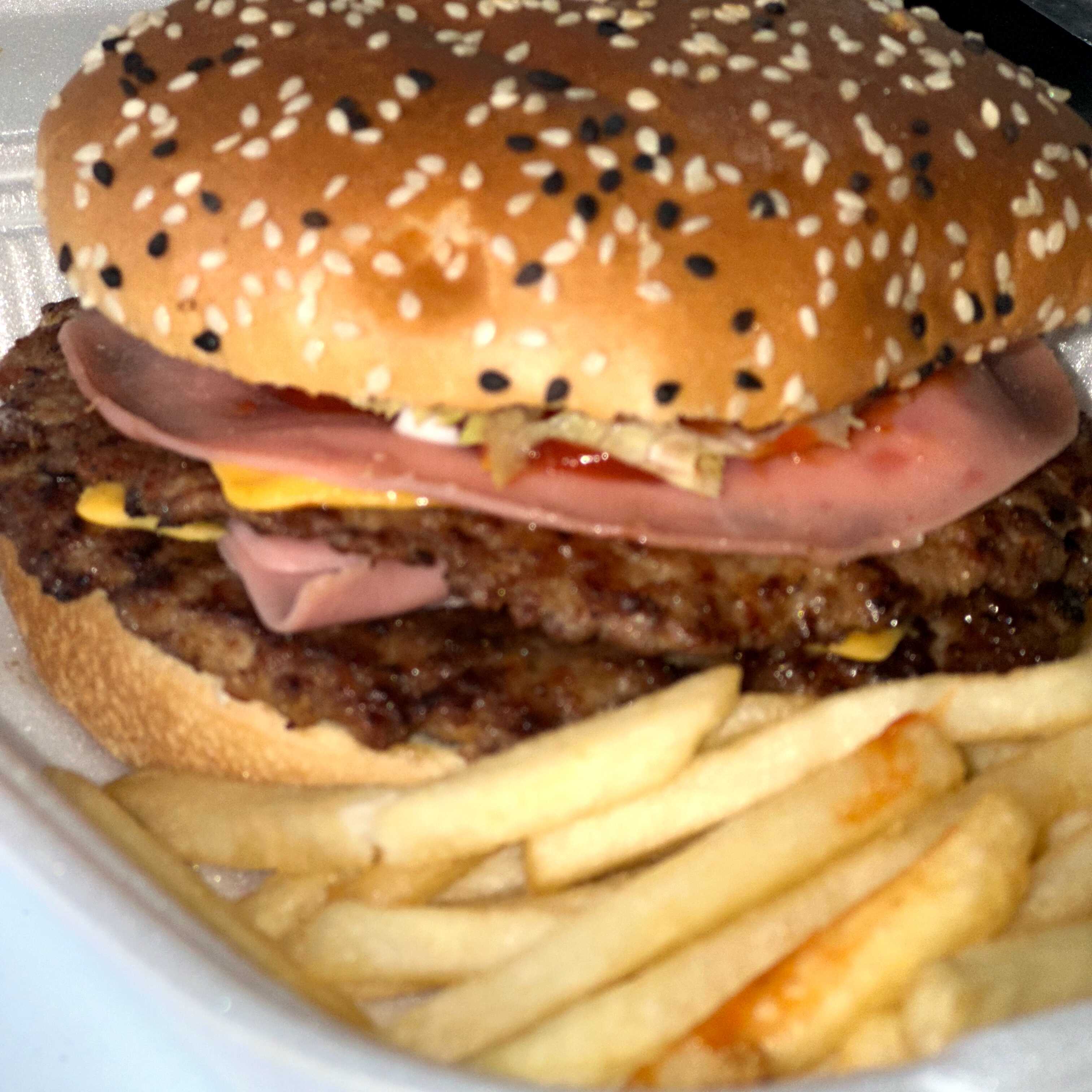 Doble carne de res, queso amarillo, una rebanada de jamon, jitomate, cebolla, lechuga, crema, catsup y mostaza.