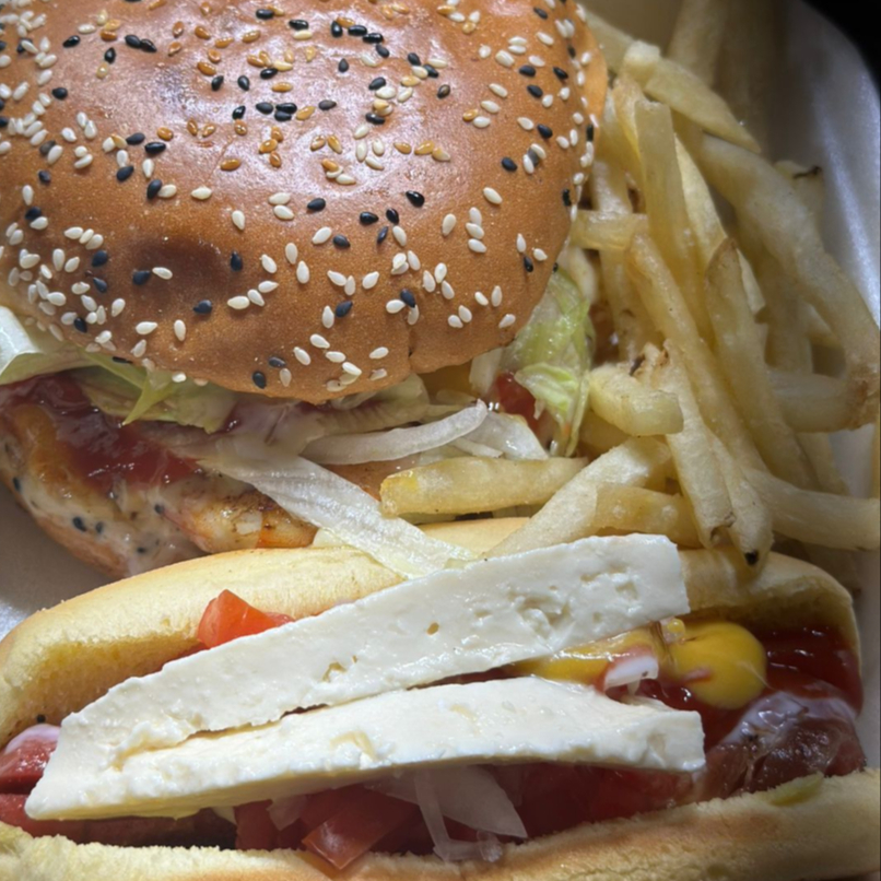 Hamburguesas de camarones gratinados*1, Hotdog sencillo*1, Refresco de 255ml*1