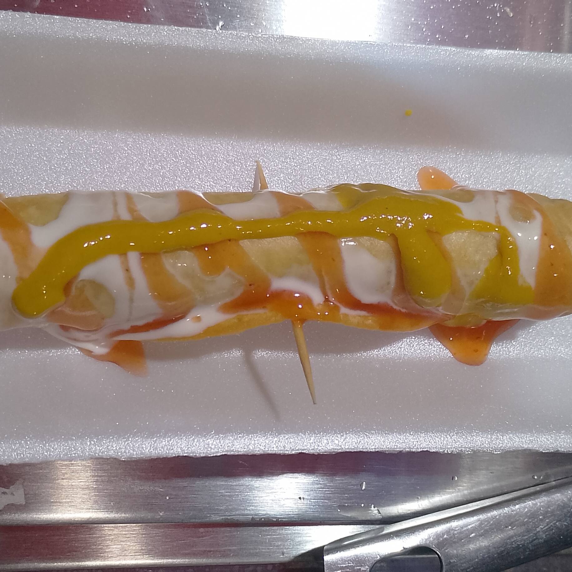 salchicha envuelta con tortilla de harina con catsup, crema y mostaza