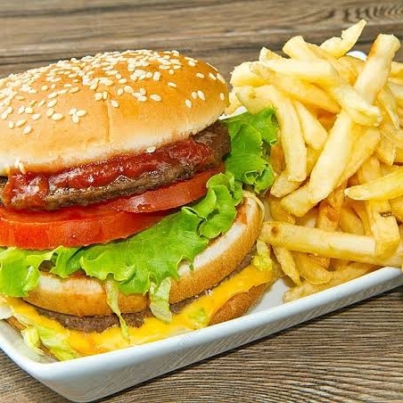Hamburguesa de res y tocino, jitomate, cebolla, lechuga, queso amarillo. acompañado de papas a la francesa