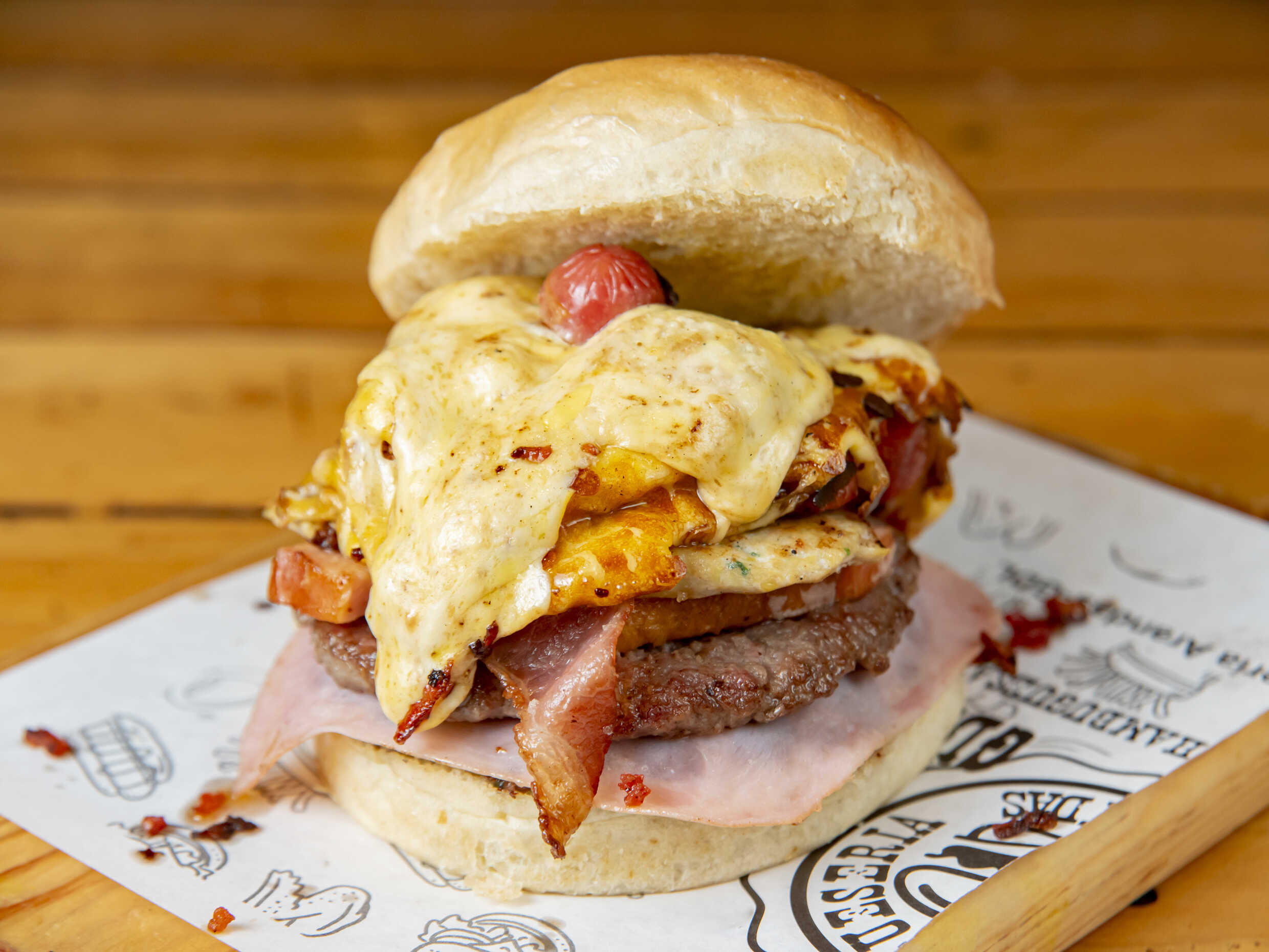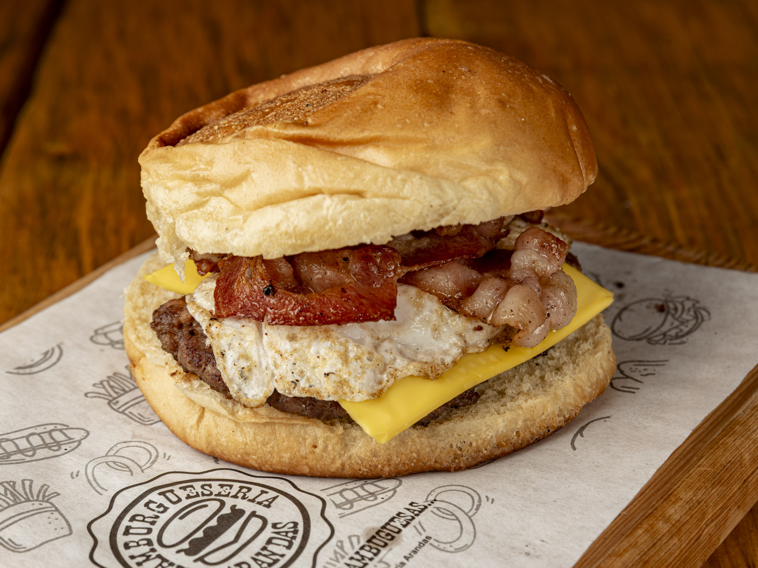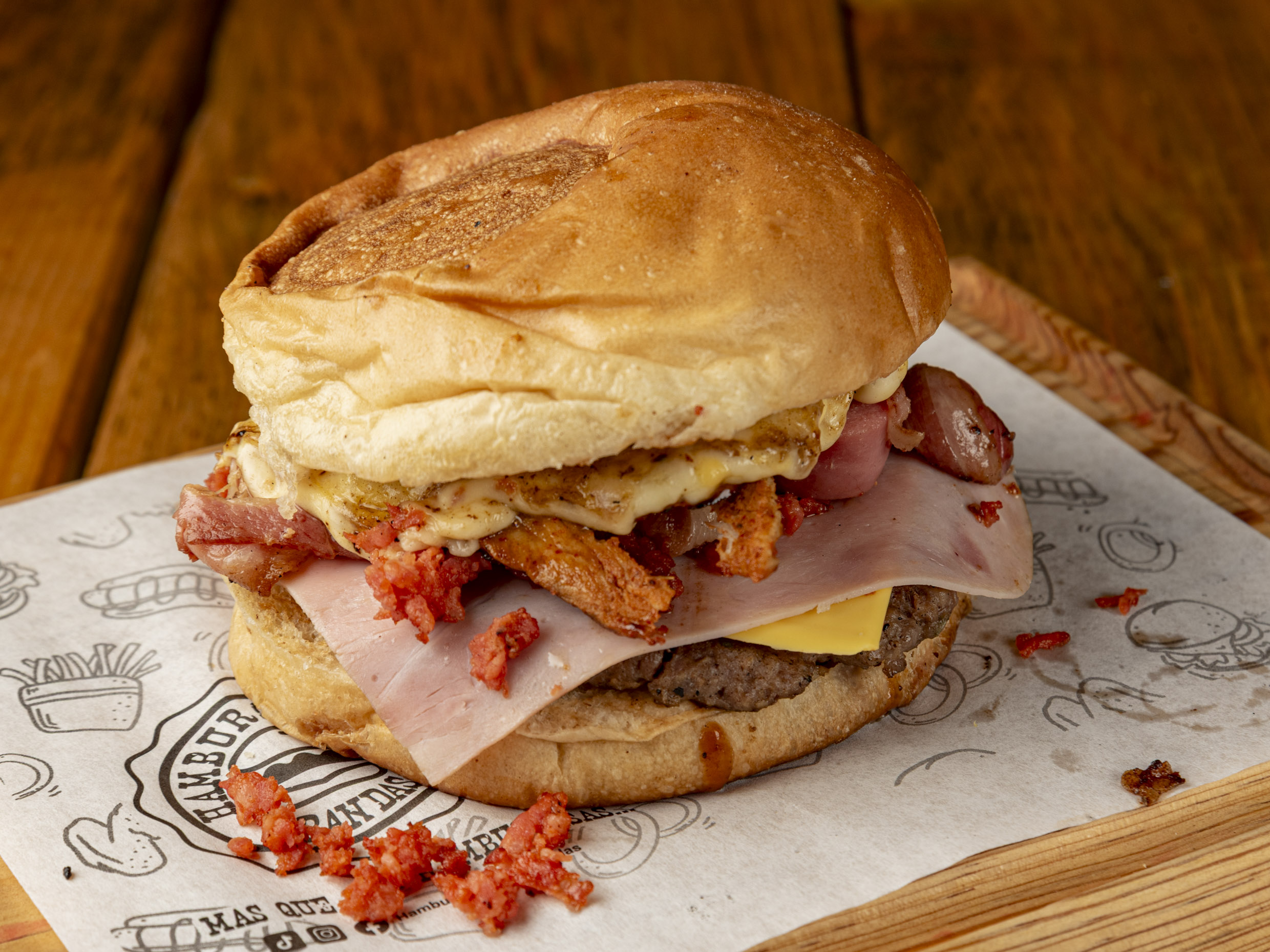 Pan artesanal, Carne 150gr, queso americano, 3 quesos, corona de cheese fundido, trocitos de tocino.