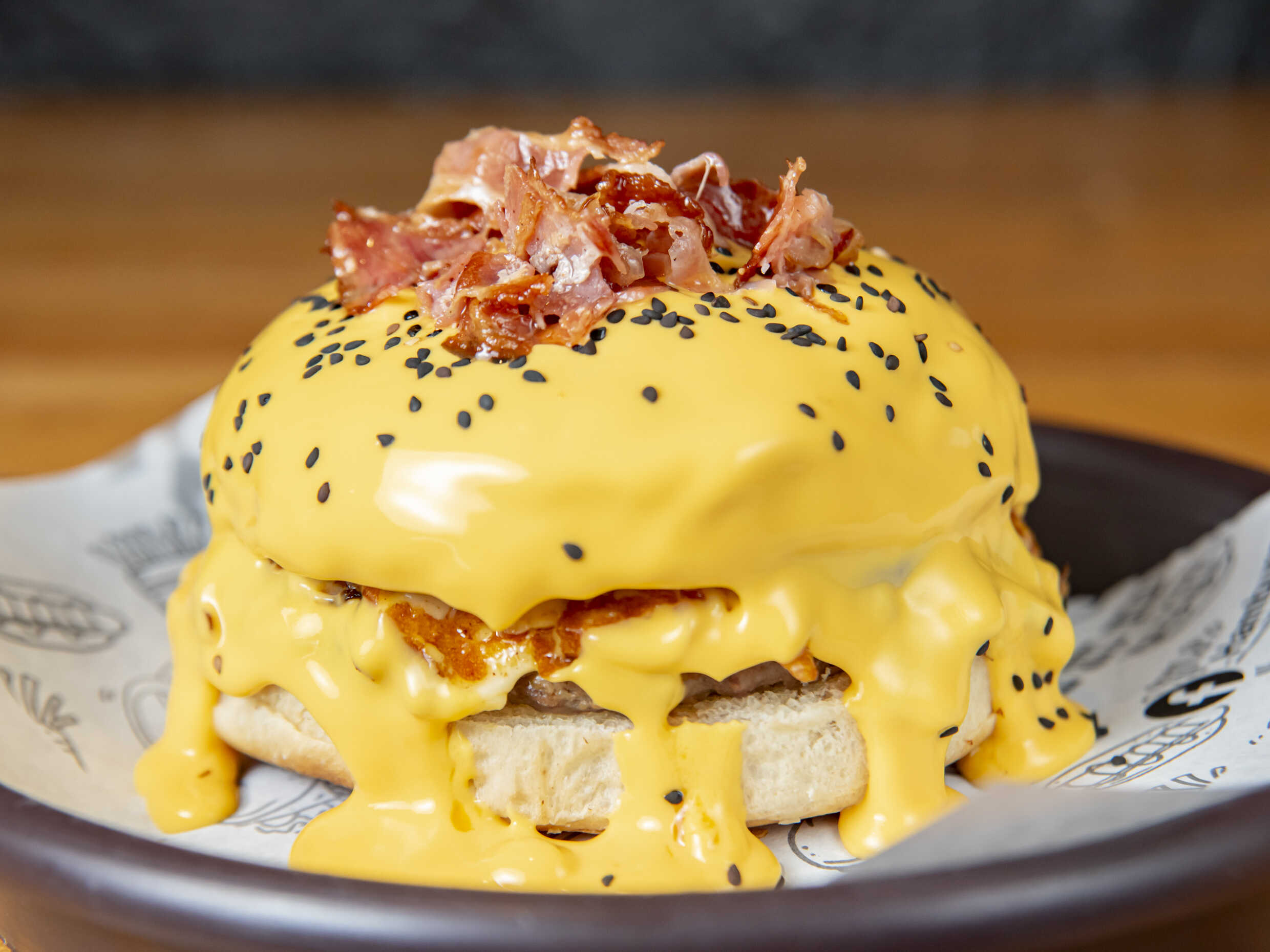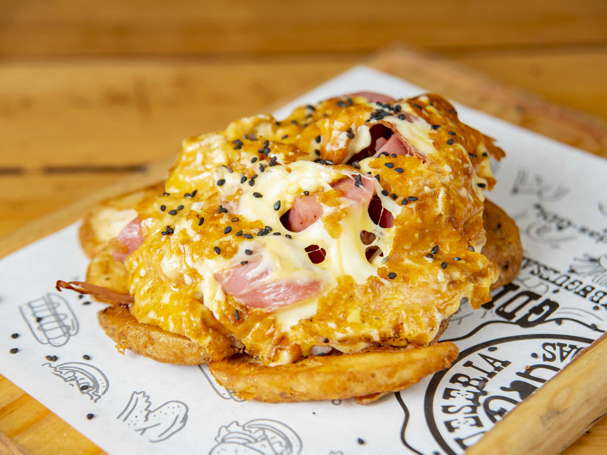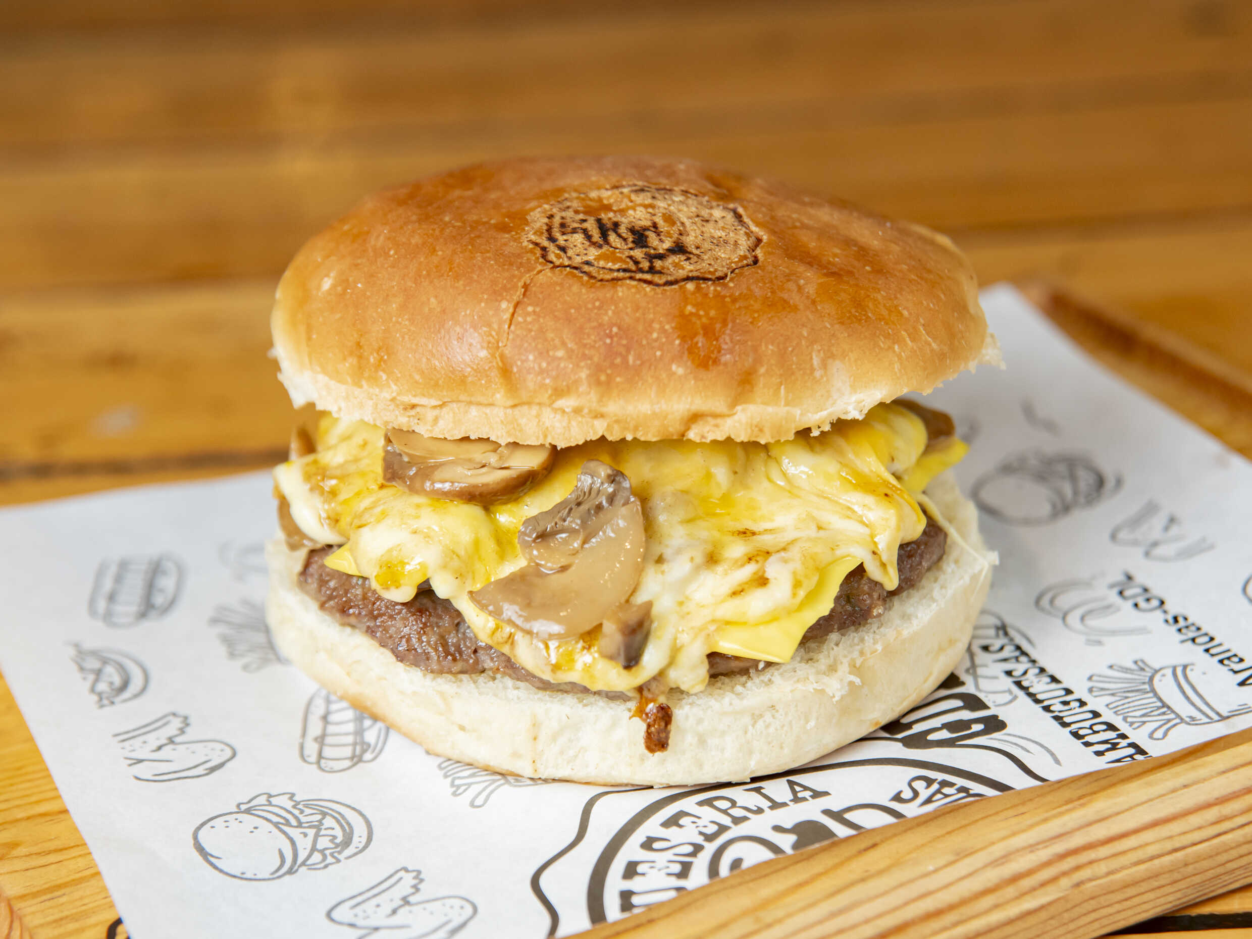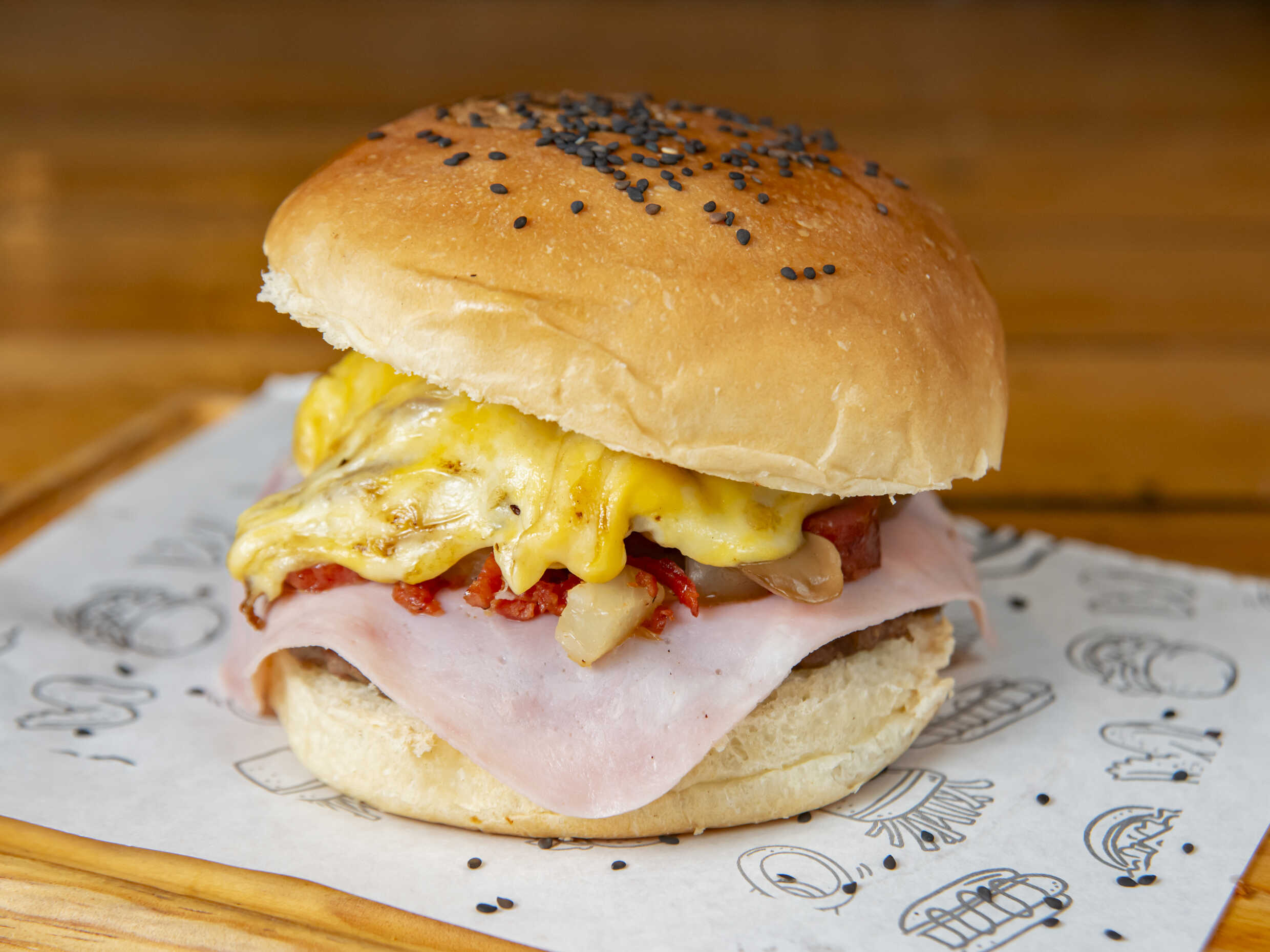Pan artesanal, Carne 150gr, queso americano, 3 quesos, corona de cheese fundido, trocitos de tocino.