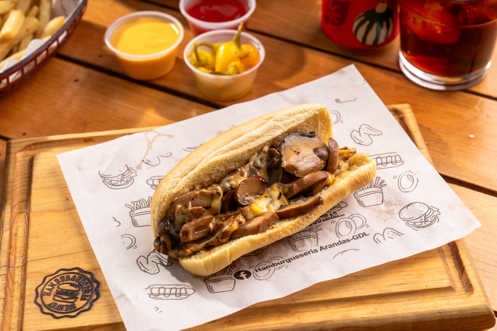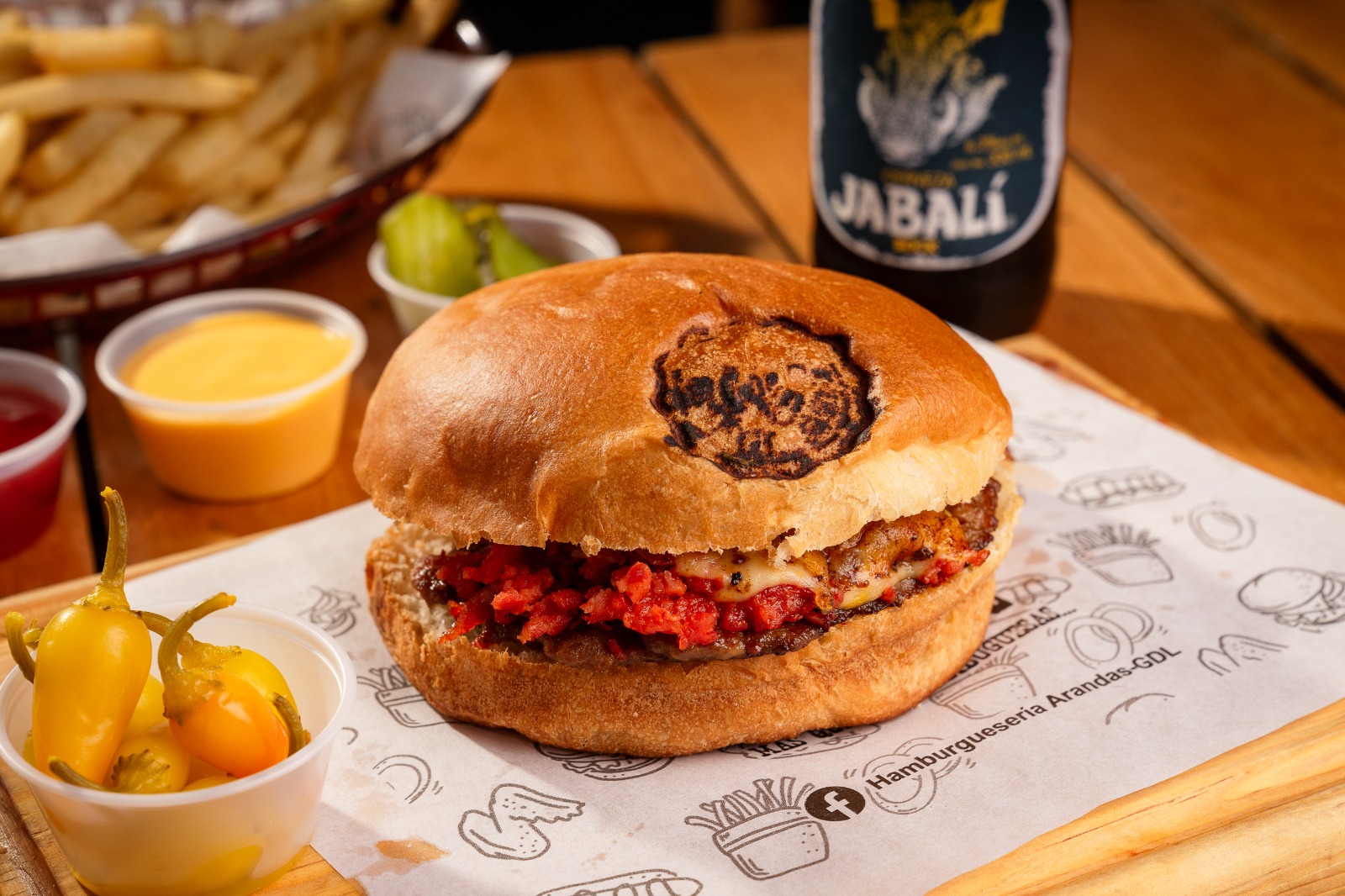 Carne de res, queso americano, mas chuleta, tres quesos, un baño de salsa arandas.