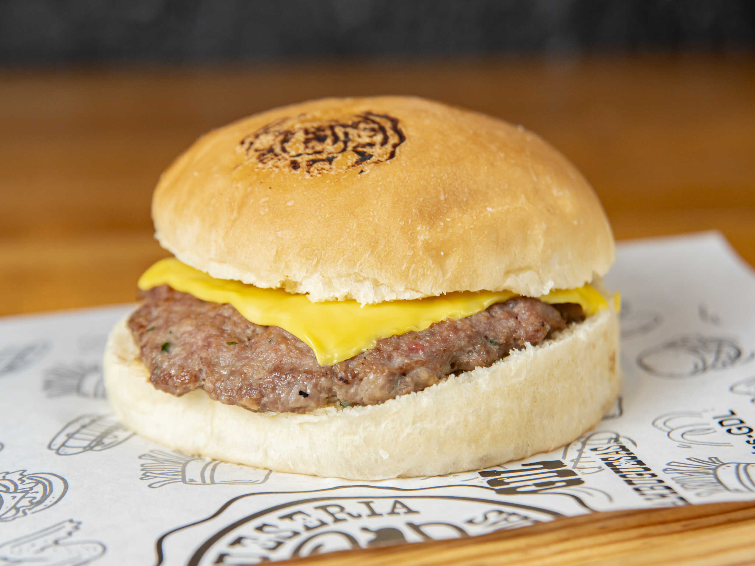 Hambuguesa estandar Pan artesanal, Carne 150gr, queso americano, 3 quesos, trocitos de tocino adicionado de una corona de cheese fundido.