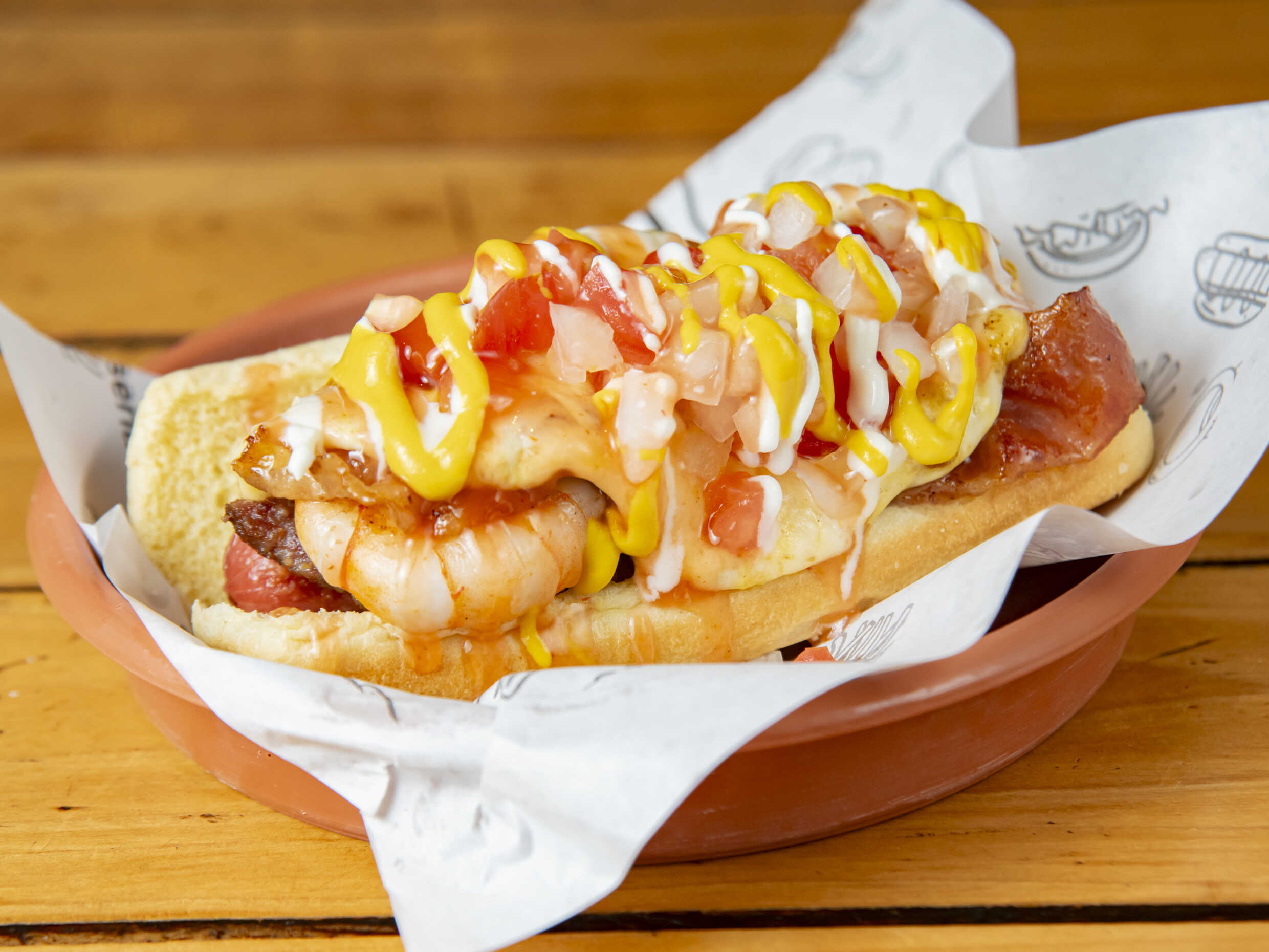 Salchicha de pavo, camarón, carne, tocino y 3 quesos.