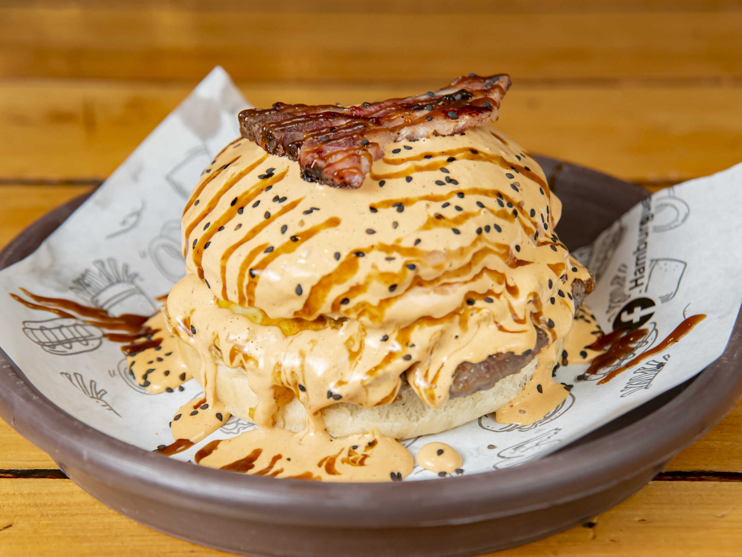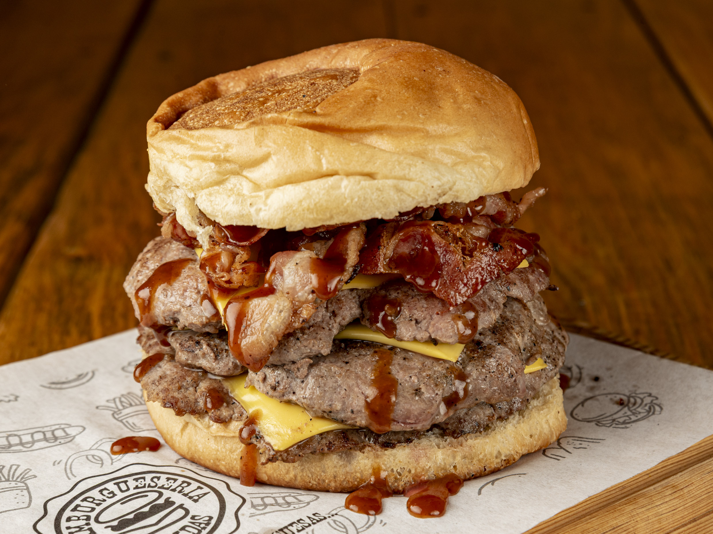 Triple carne de arrachera, 3 quesos americano, tocino, BBQ.