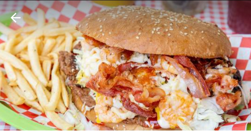 Hamburguesa camarón hawaianos( jamón y piña) Mozarella y papas
