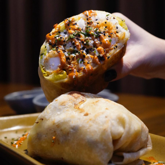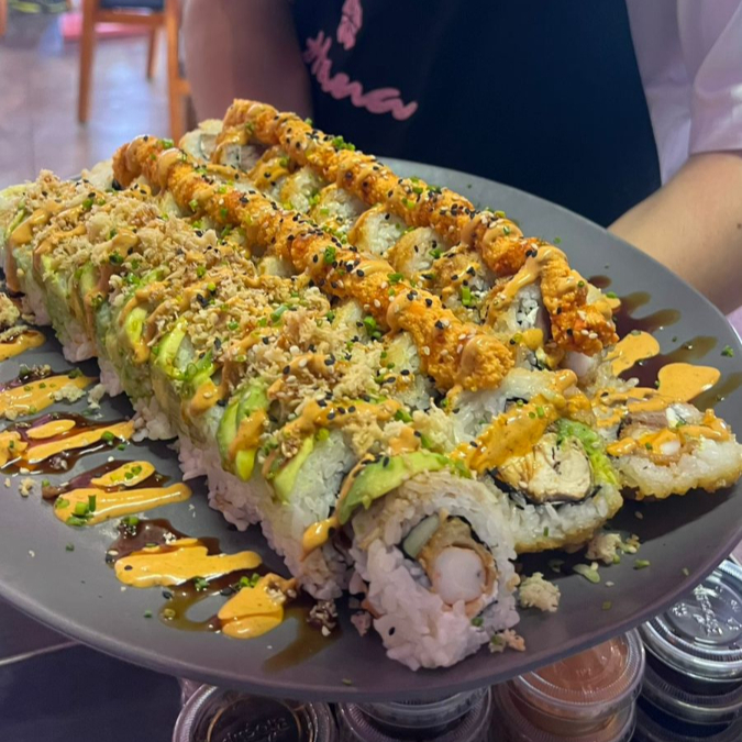 Delicioso burro japonés frito, a base de arroz y alga nori, relleno de atún, salmón, camarón tempura, lechuga, pepino, aguacate, philadelphia, bañado en aderezos de la casa y anguila.
