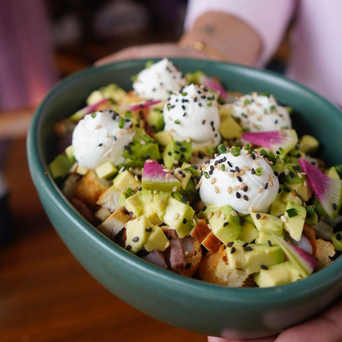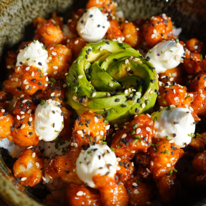 Camarones capeados en salsa especial, sobre cama de arroz, acompañados de aguacate, queso crema, ajonjolí y cebollino fresco.