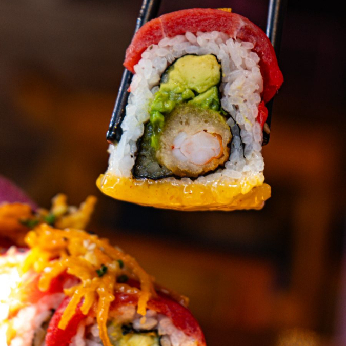 Rollo relleno de camarón tempura, pepino, aguacate; forrado de spicy tuna, togarashi y bañado en dressing de la casa.
