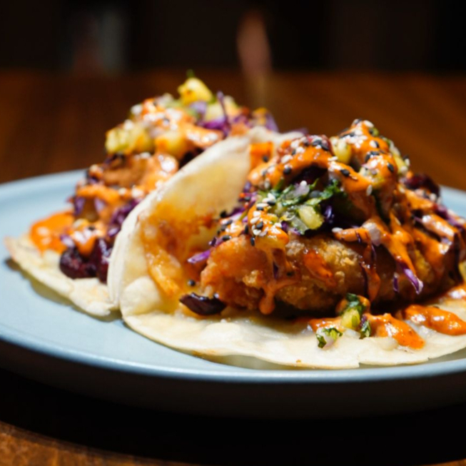 Tacos con tortilla de maíz o harina, camarón capeado, queso manchego, ensalada de col morada, aderezo de la casa y salsa picante.