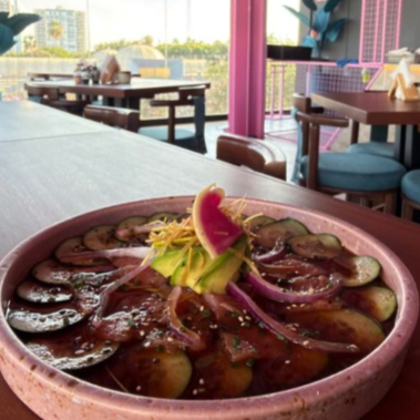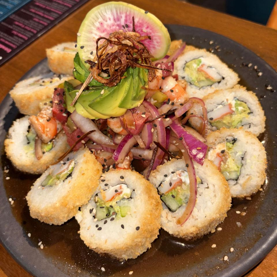 Rollo frito relleno de pepino, aguacate, queso crema, surimi capeado acompañado de aguachile de piña coronado con cebolla crunchy.