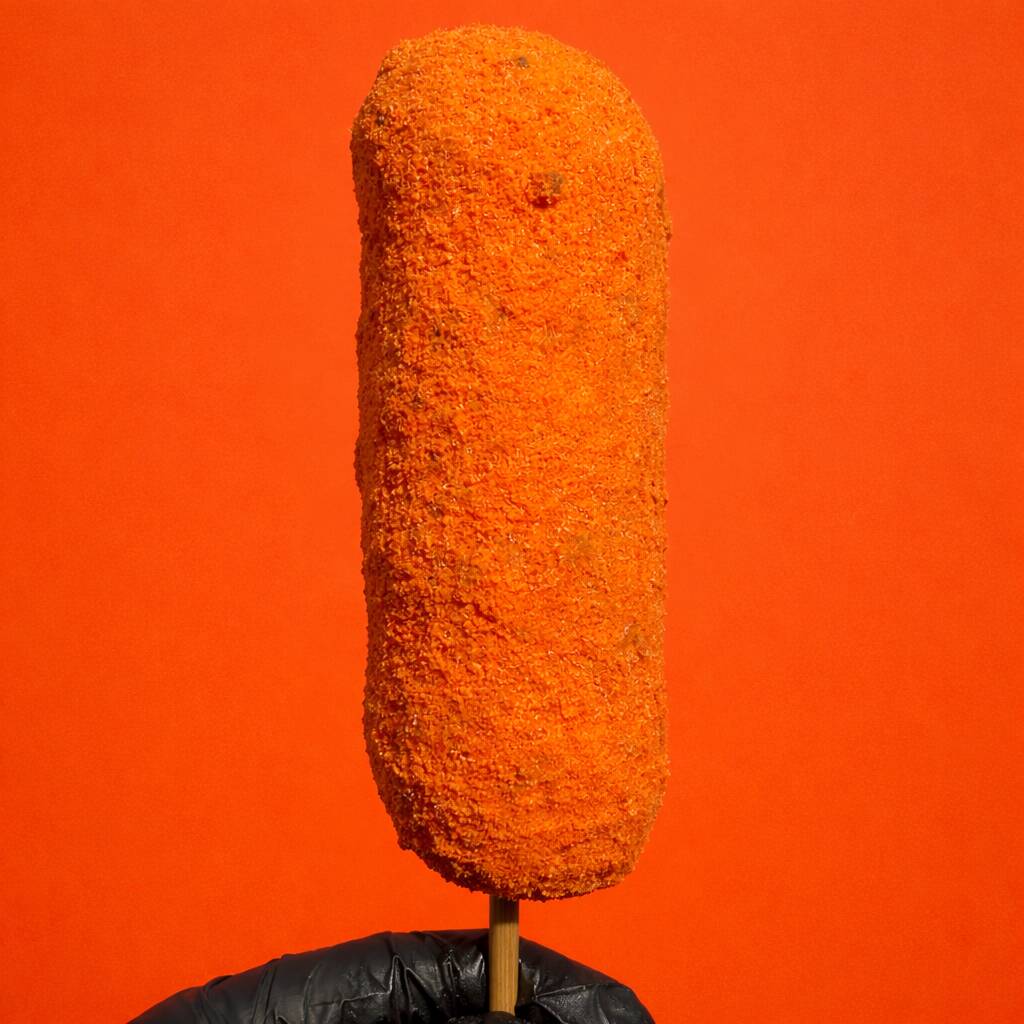 Banderilla empanizada de cheetos de queso.