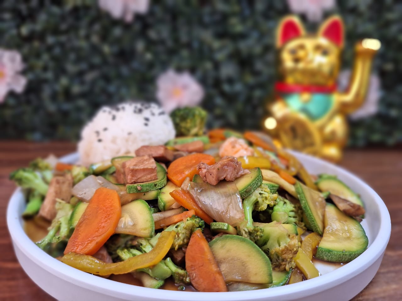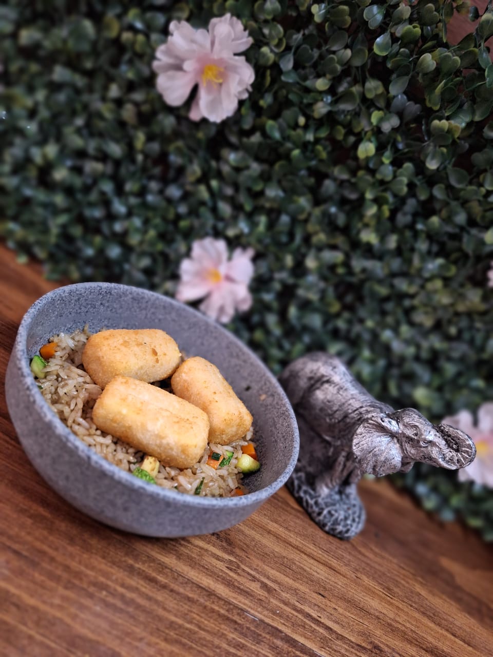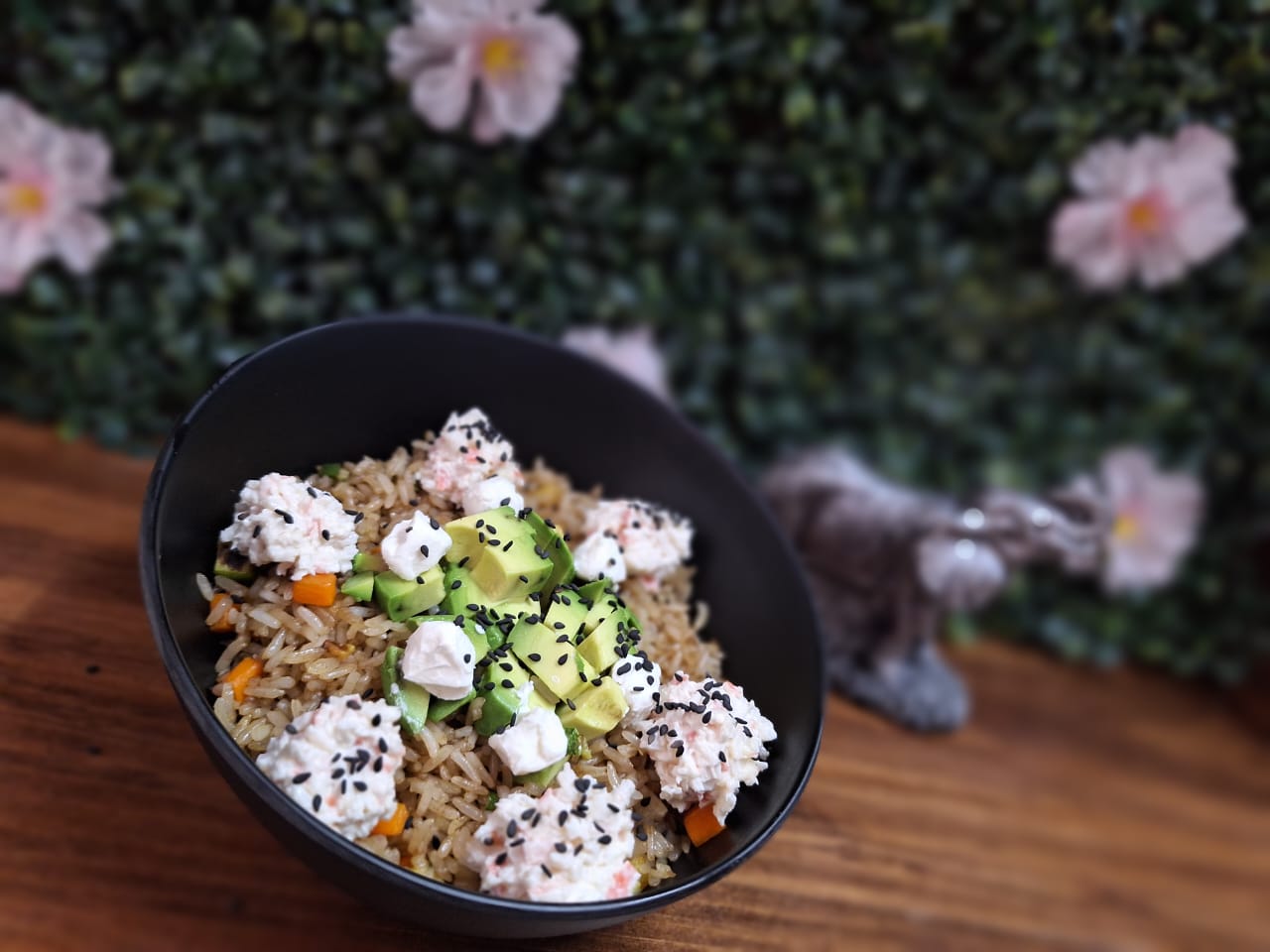 Arroz frito calabaza, zanahoria, calabaza y cebollín, encima aguacate, philadelphia y ensalada tampico.