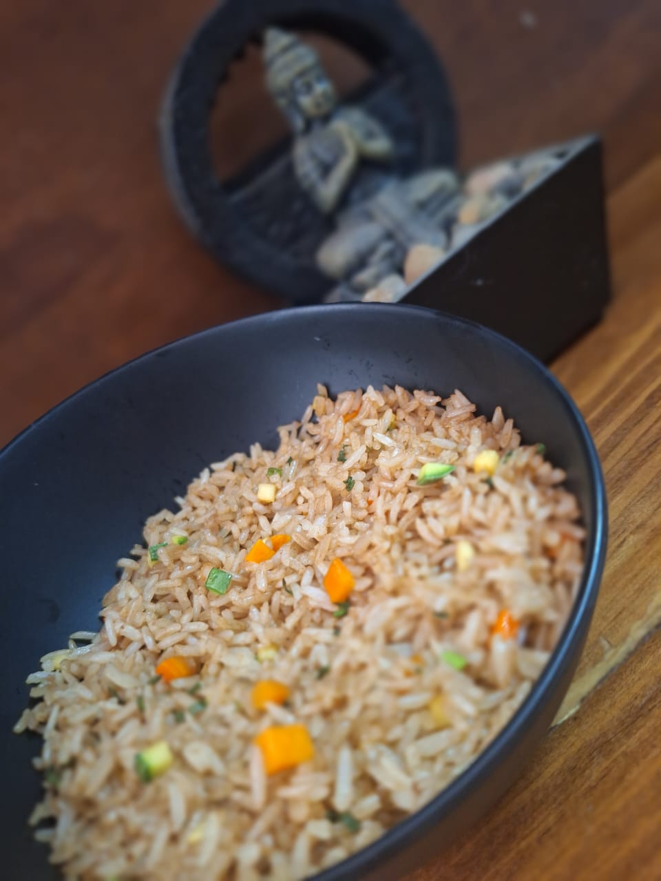 Arroz frito con zanahoria, calabaza y cebollín.