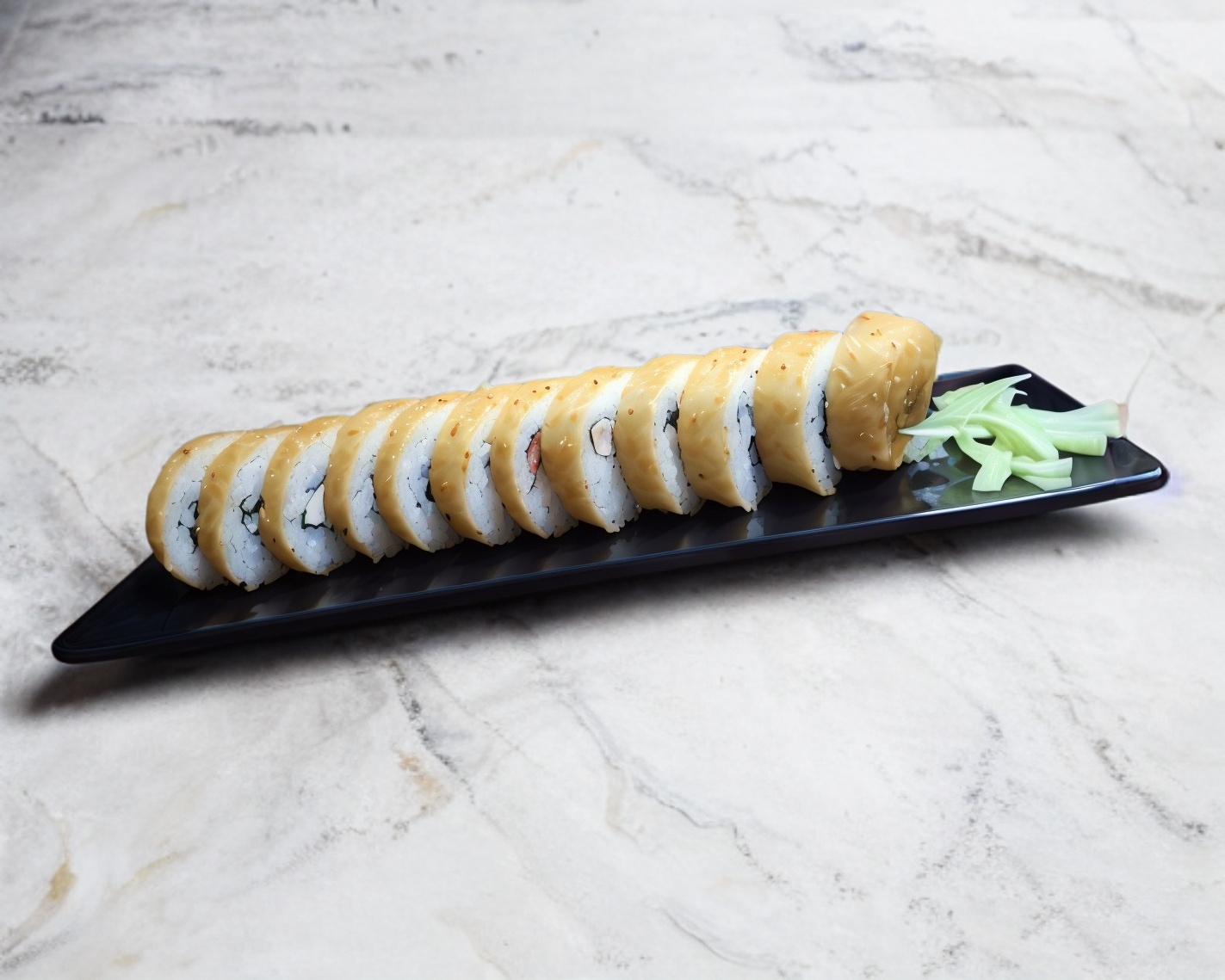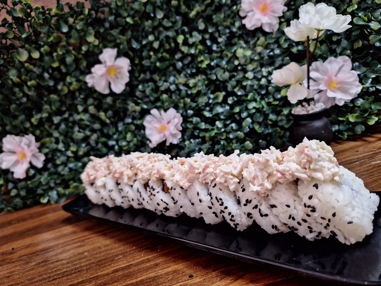 Sushi natural bañado en ajonjolí y ensalada tampico encima, relleno de aguacate, philadelphia, pepino y proteína a elegir.