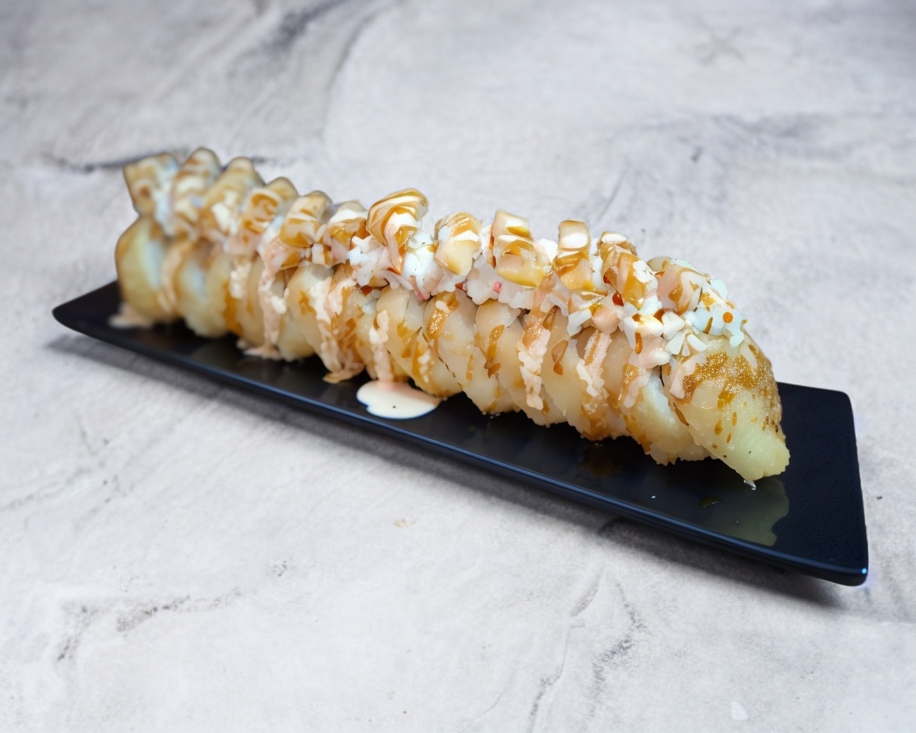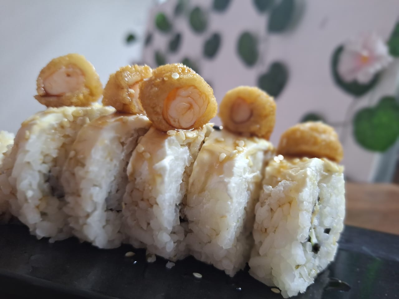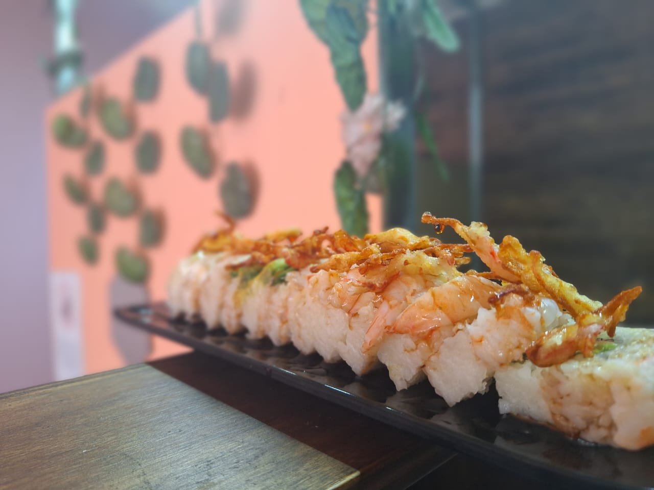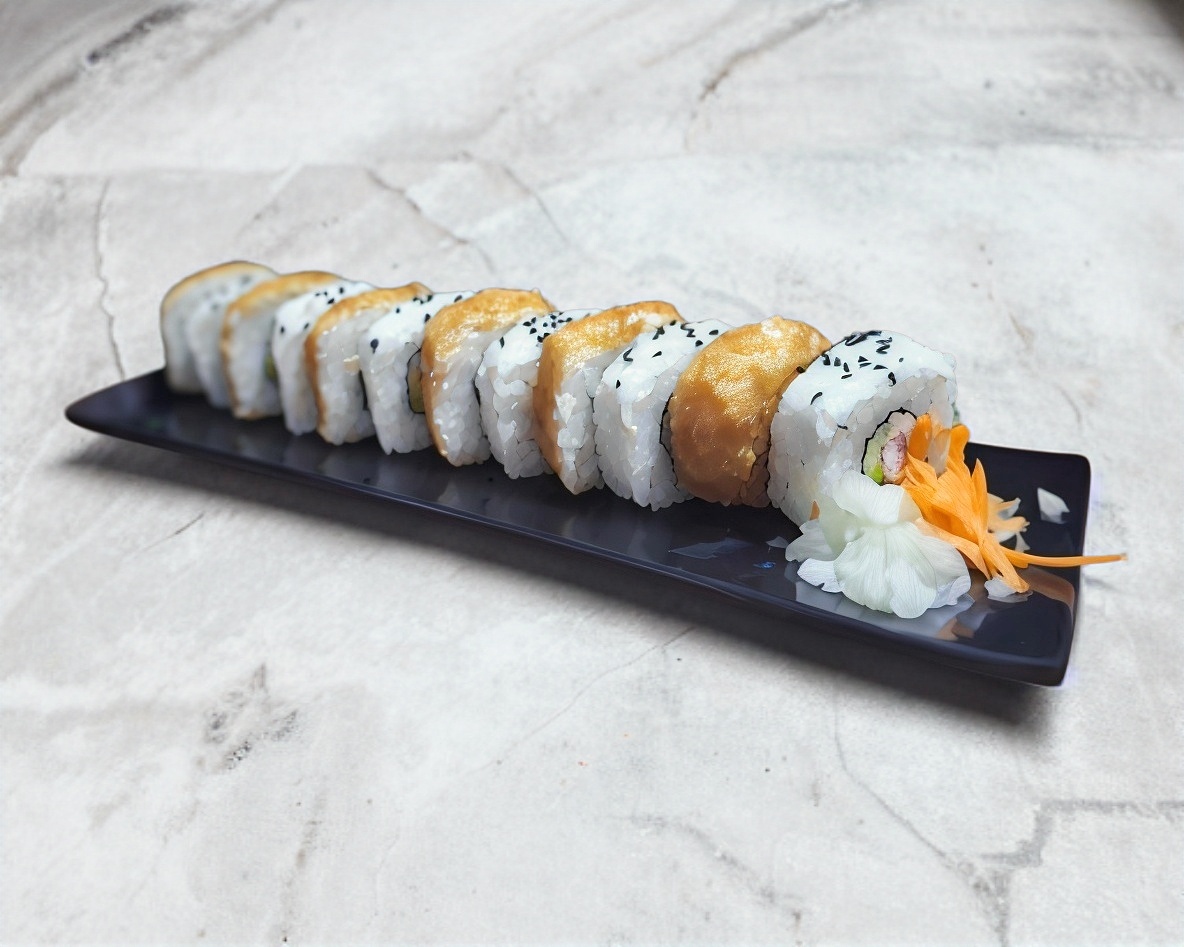 Sushi natural forrado de camarón, aguacate y philadelphia, encima kanikama tempurizado y salsa agridulce spicy, relleno de aguacate, pepino y philadelphia.