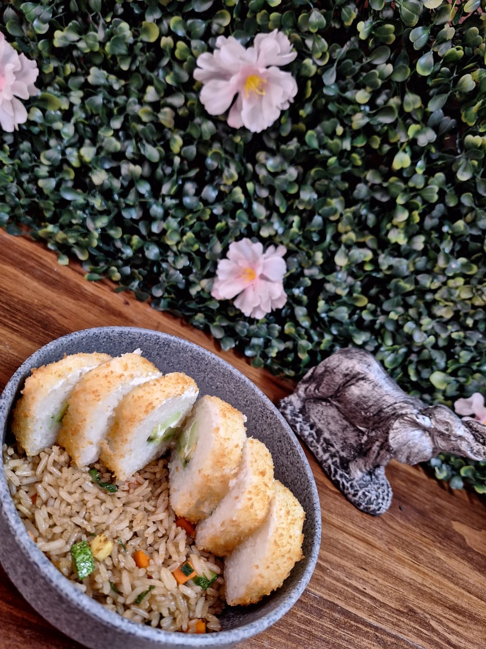 Medio sushi empanizado de surimi y media porción de arroz frito vegetariano.