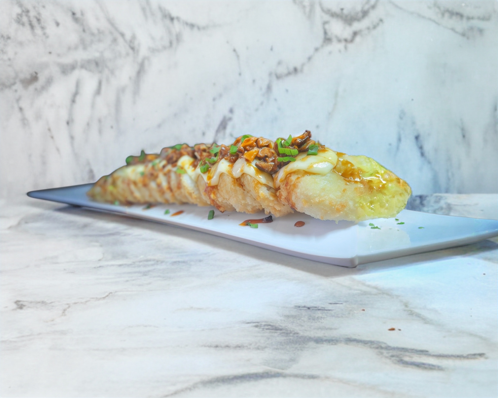 Sushi frito, relleno de philadelphia, aguacate, res y camarón, encima, queso, res, cebollín, bañado en salsa agridulce spicy.