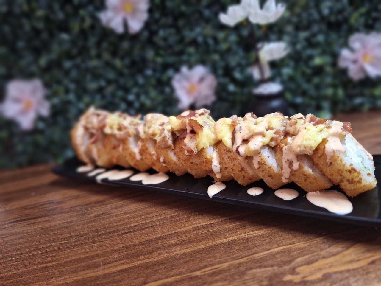 Sushi frito con toping de queso, pollo y tocino bañado con aderezo chipotle relleno de aguacate y philadelphia.