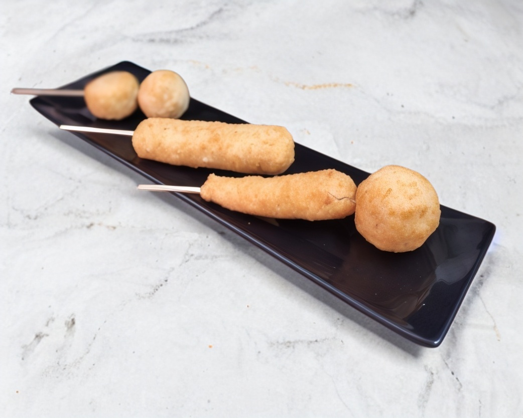 3 Pequeñas brochetas de queso acompañadas de media porción de arroz frito.