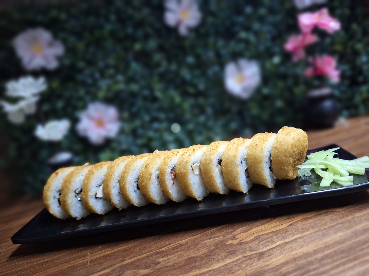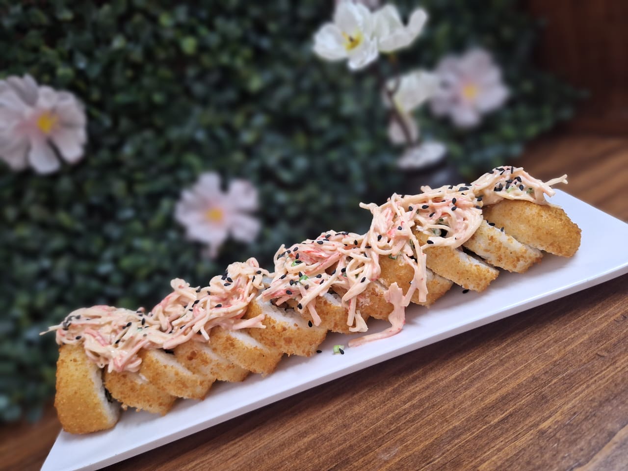 Sushi gigante frito, relleno de philadelphia, topping cordon bleu, ensalada kanikama y pollo empanizado.