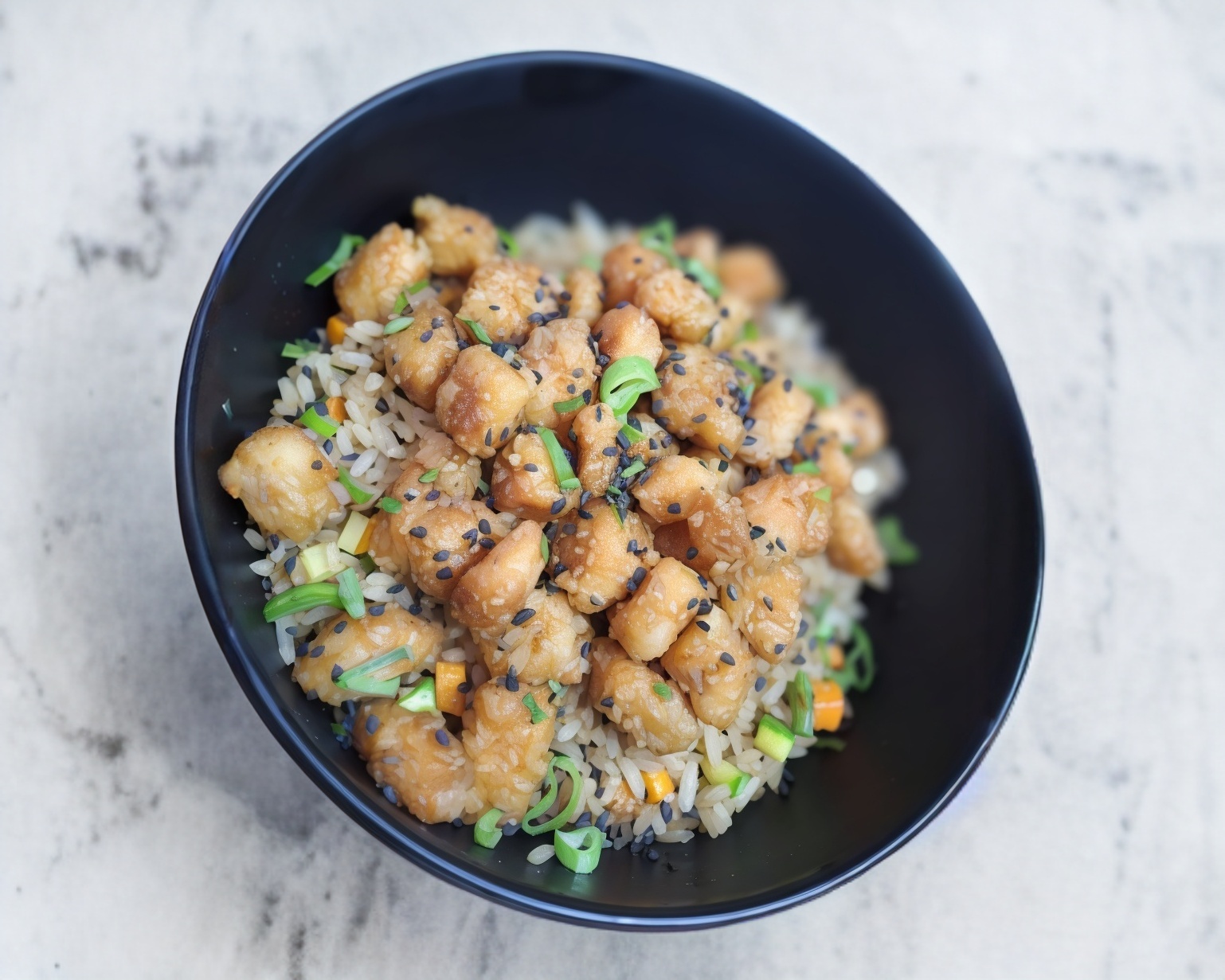 Pollo empanizado bañado en salsa agridulce, cebollín y ajonjolí, acompañado de arroz frito.