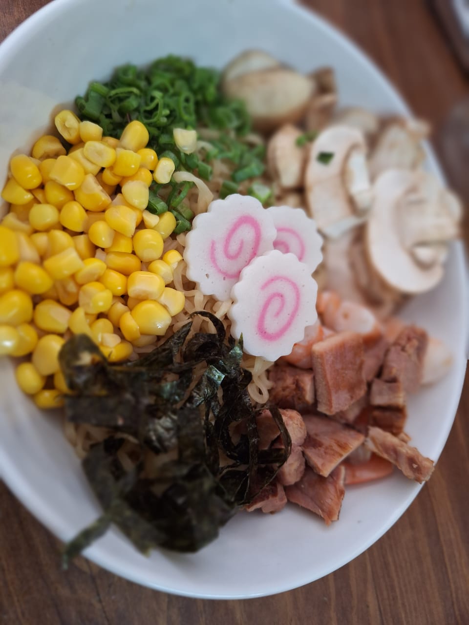 Fideo, champiñón, elote amarillo, cebollín, alga nori y naruto.
