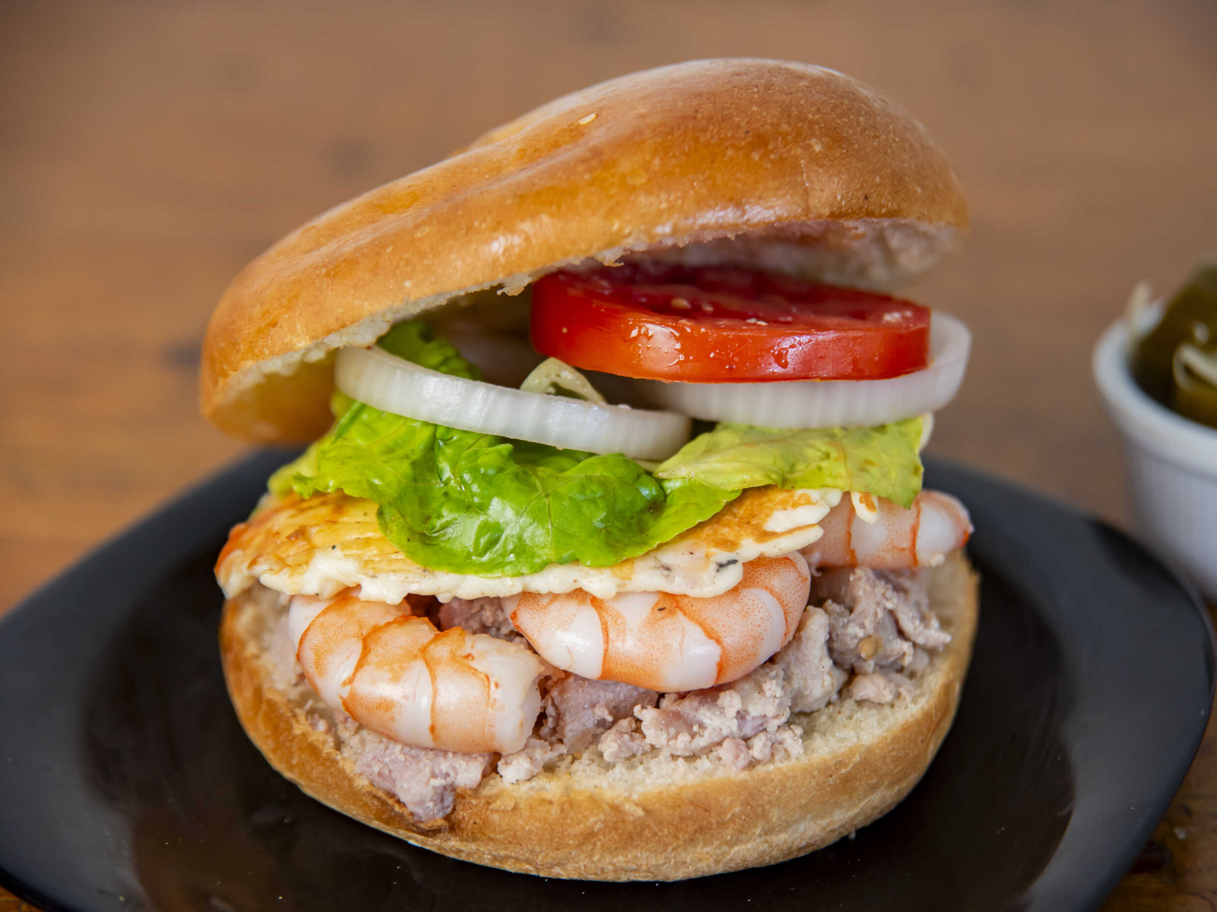 costra de queso bistec y camarones pan con mantequilla, aderezo especial, sobres de catsup