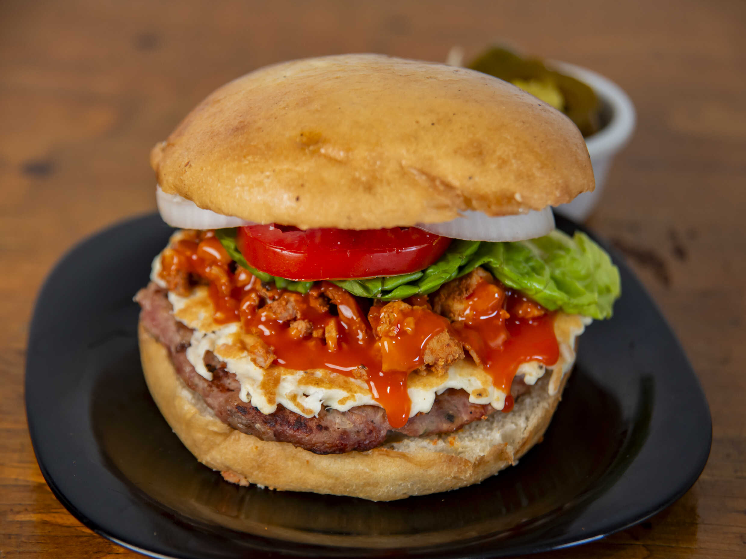 carne burger costra de queso con bufalo y pastor pan con mantequilla, aderezo especial, sobres de catsup
