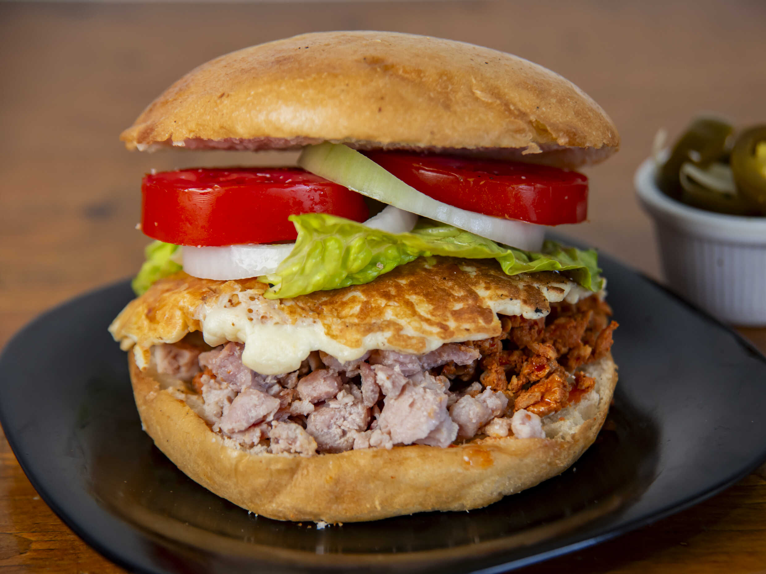 Triple carne con queso, pan con mantequilla, aderezo especial, sobres de catsup