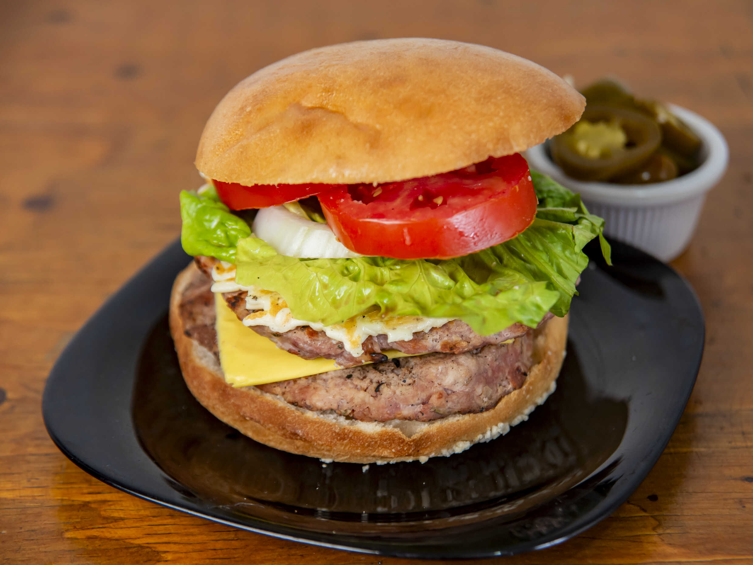 Doble carne doble queso, pan con mantequilla, aderezo especial, sobres de catsup
