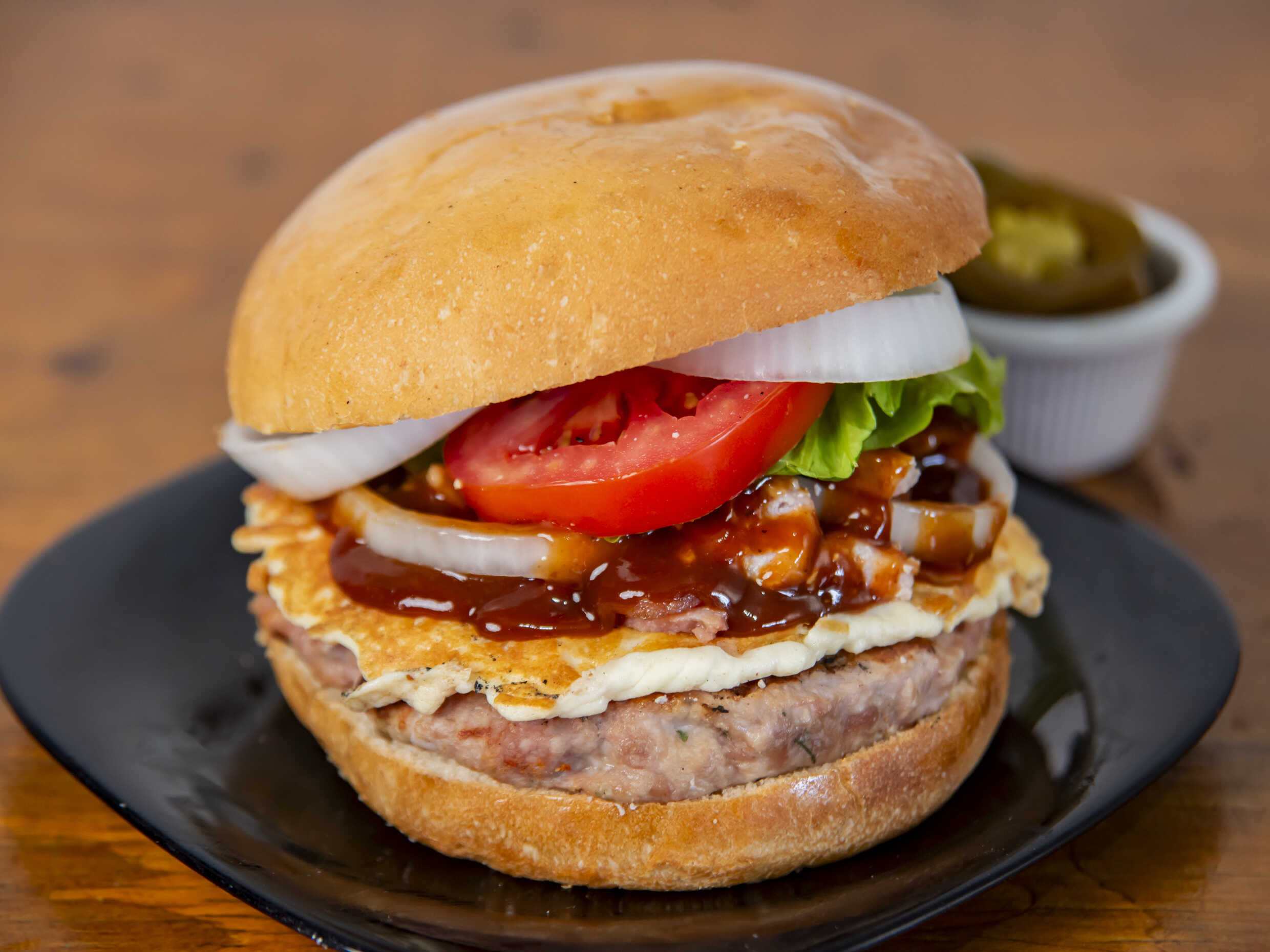 carne burger con queso y bbq pan con mantequilla, aderezo especial, sobres de catsup