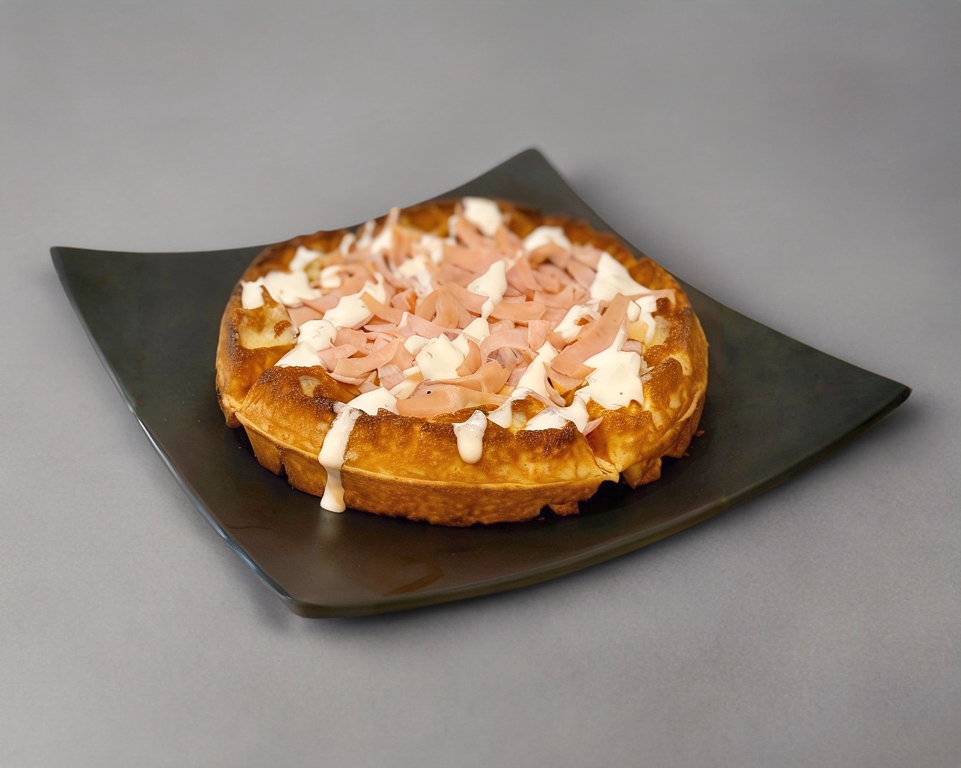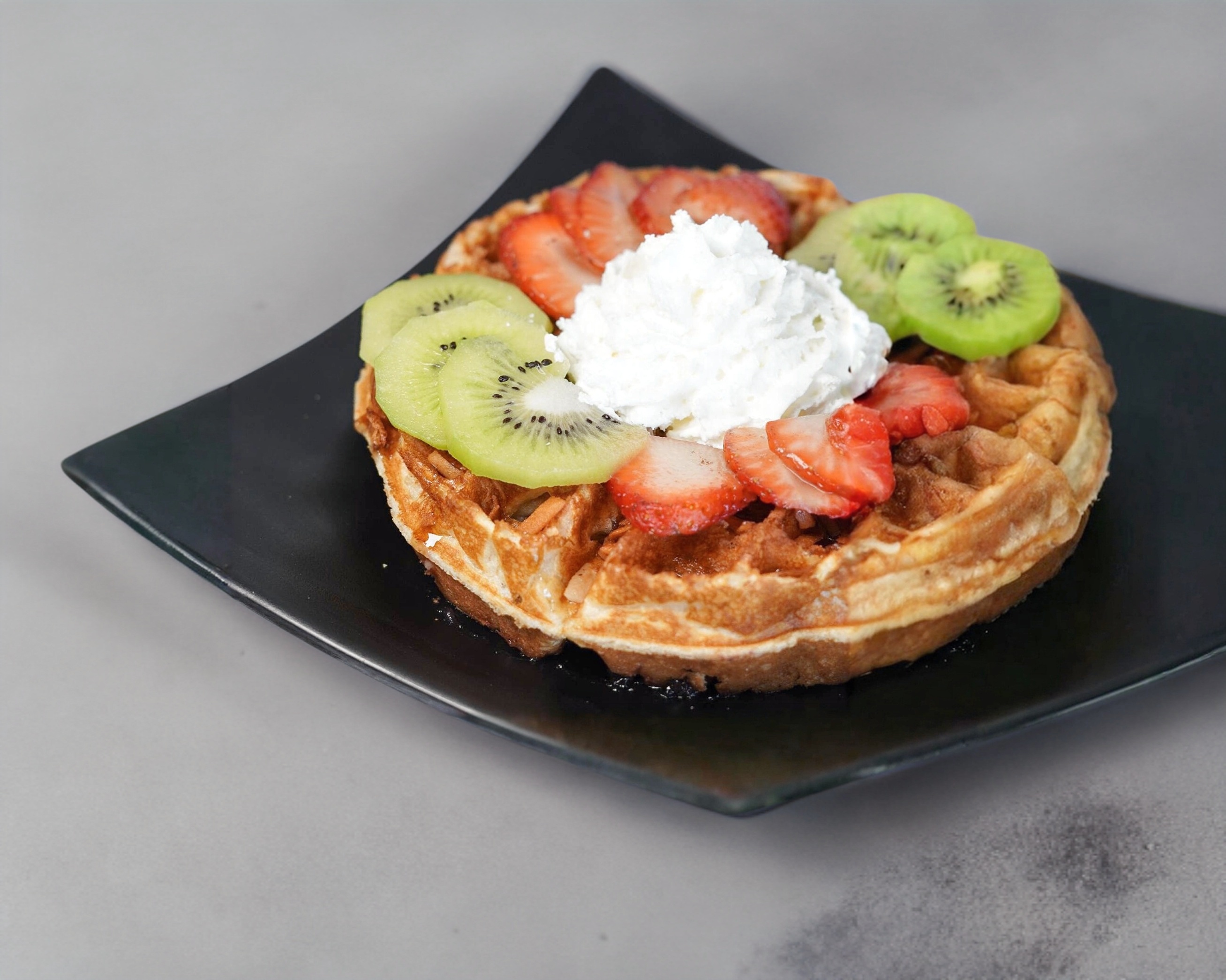 2 huevos revueltos, 2 rebanadas de tocino y 1/2 waffle con topping a elegir