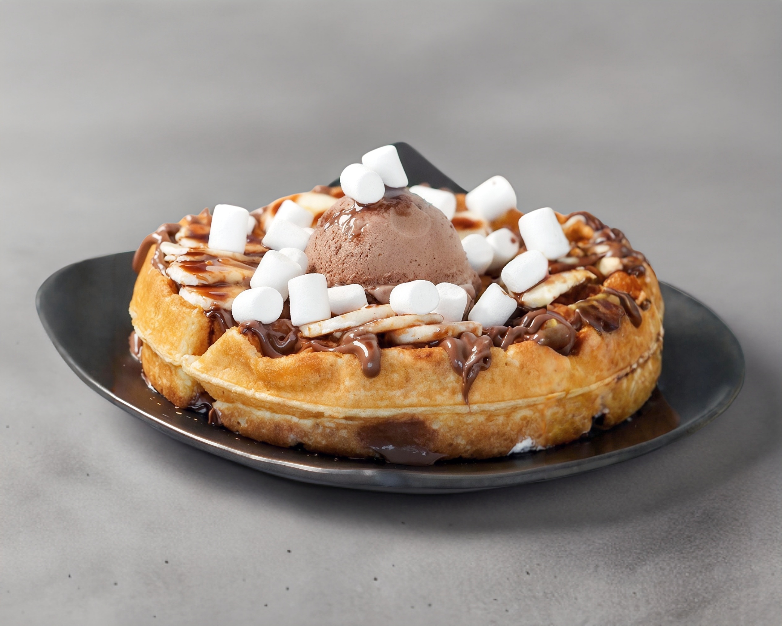 Waffle, Nutella, helado de chocolate, fresa, galleta oreo. Sabor del helado puede variar según disponibilidad. (porción personal)