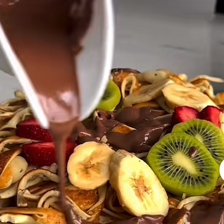 Tiras de crepa , blueberry, frambuesa y plátano , decorado con ganache de chocolate y espolvoreado de azucar glass