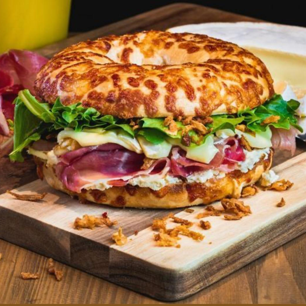 Jamón salami , , queso suizo , cebolla morada caramelizada , y espinaca. Aderezado con chipotle de la casa