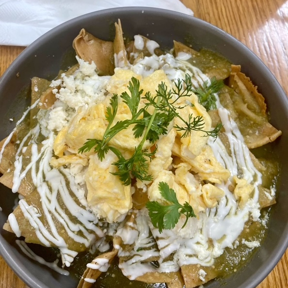 Chilaquiles verdes o rojos con huevo revuelto ó , estrellado crema , , cebolla fileteada y queso espolvoreado. Acompañado de hummus de frijol.