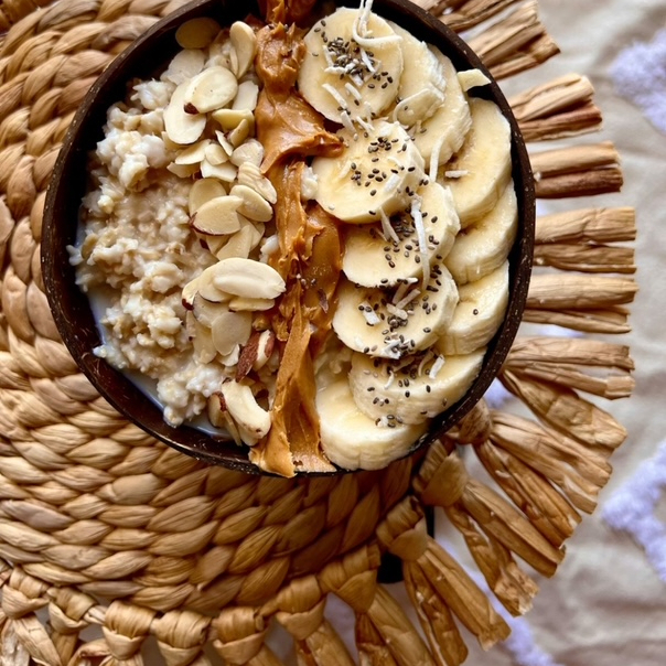 Avena con leche de coco trocitos de , nuez chía , , vainilla y el toque de crema de café