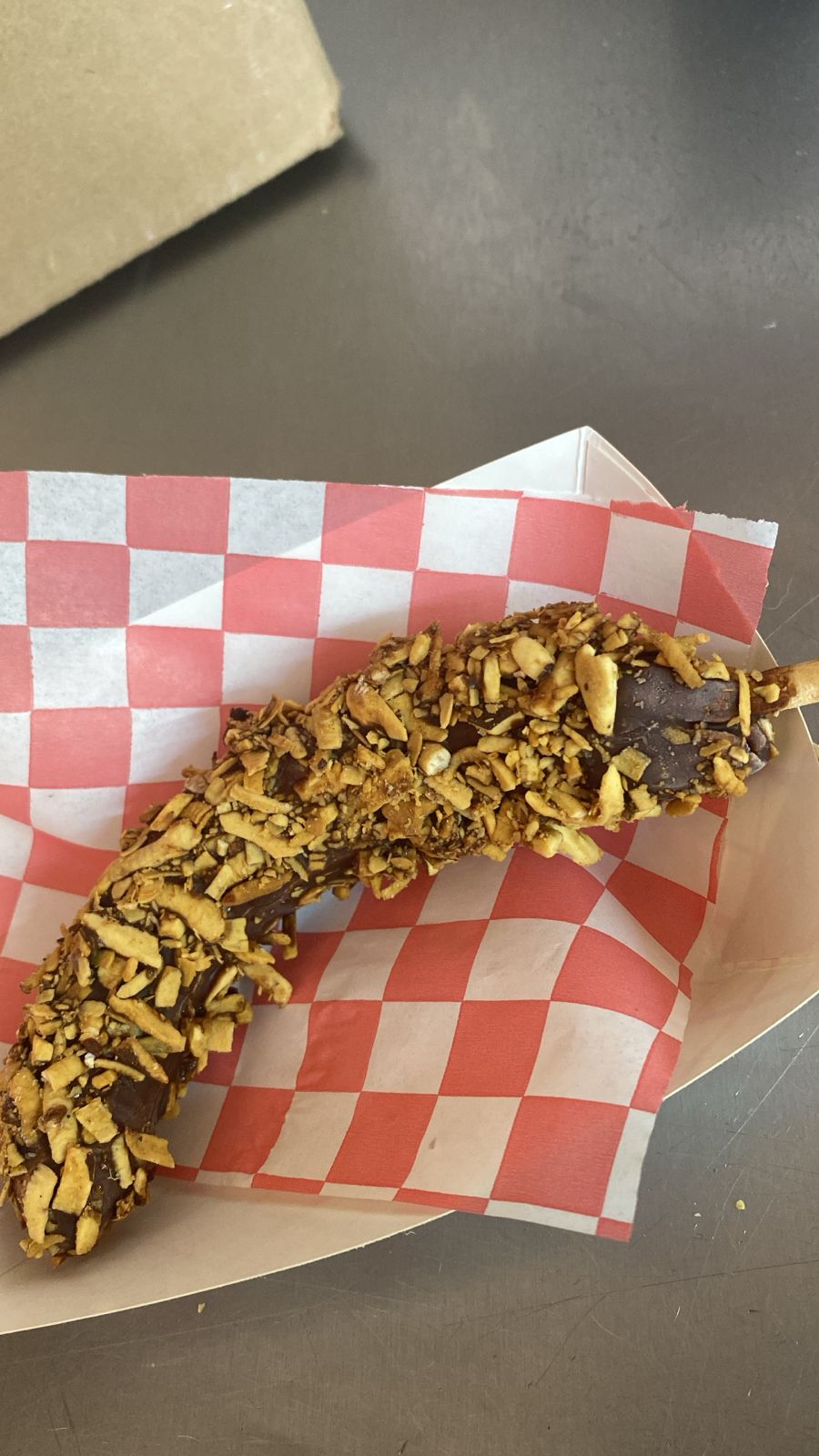 Plátano cubierto de chocolate y coco tostado.