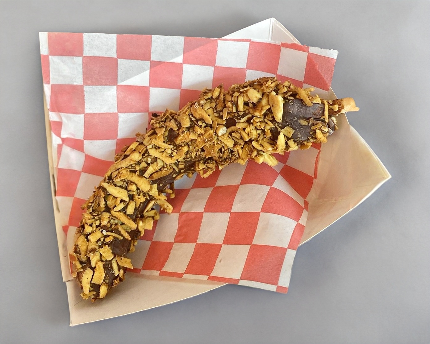 Plátano cubierto de chocolate y coco tostado.