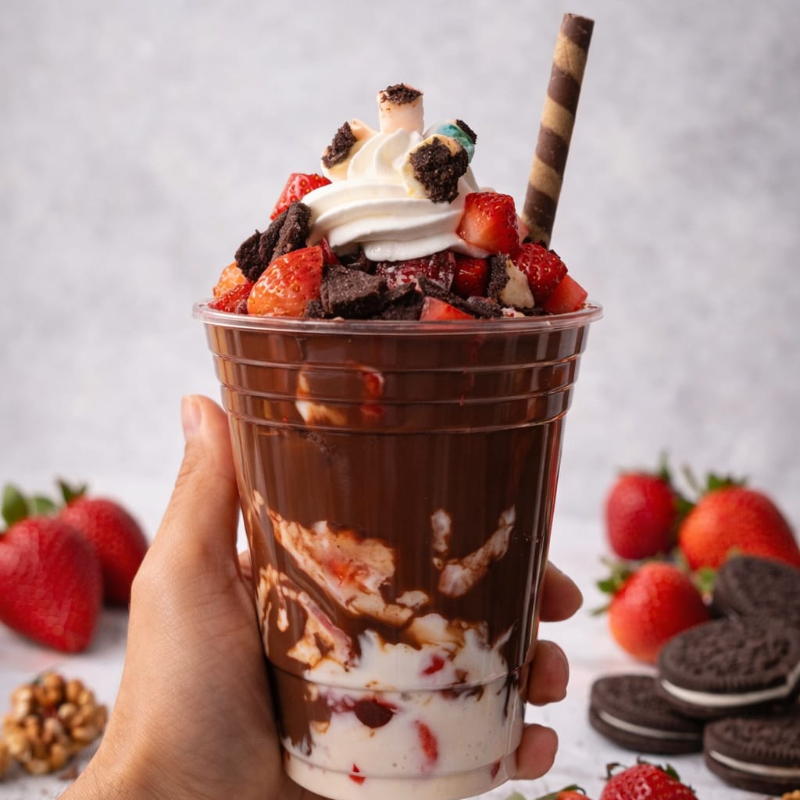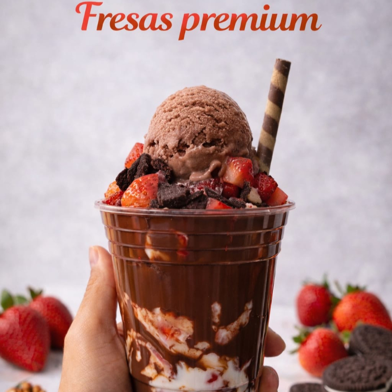 Fresas naturales en mitades con crema gourmet casera, Nutella y 2 toppings de tu elección.