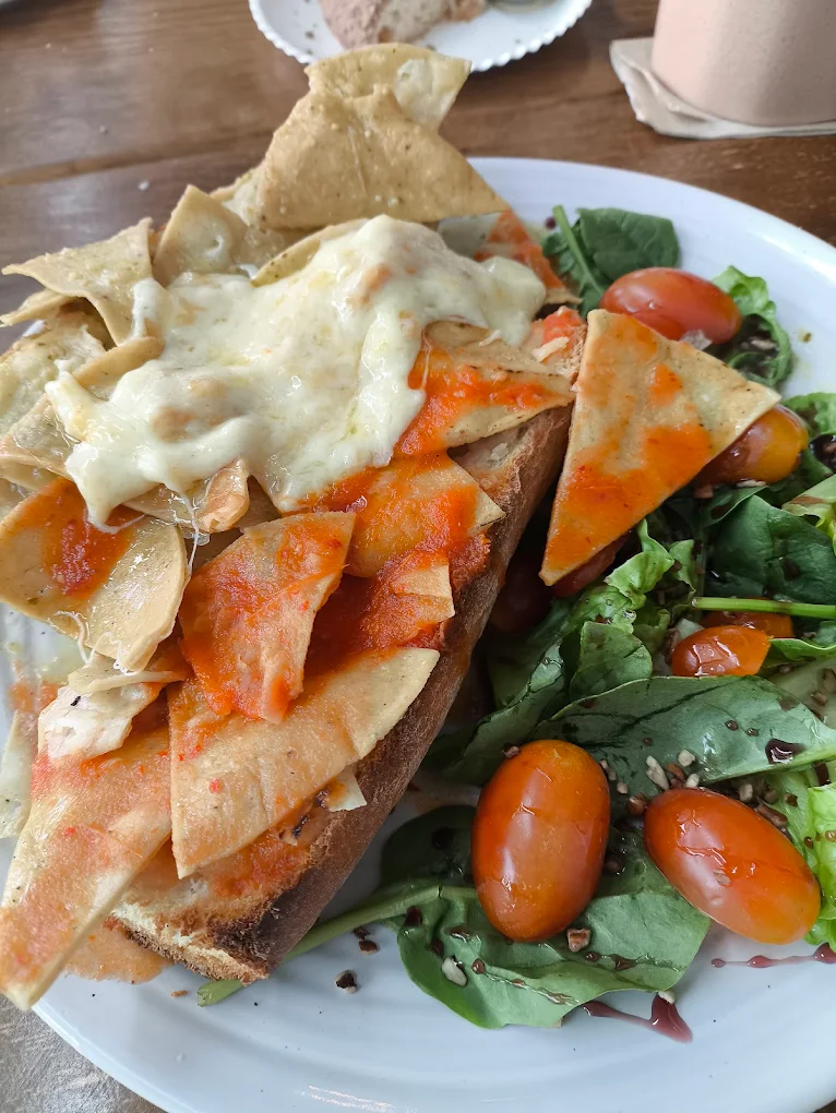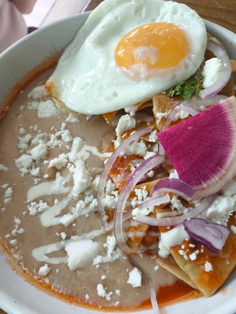 Huevo revuelto con totopos, bañados en salsa verde o roja. Acompañados de frijoles refritos con queso de mesa o ensalada de espinaca con aderezo de reducción de vino tinto.