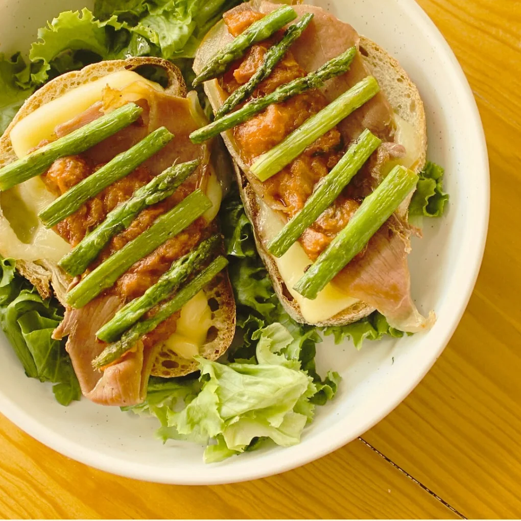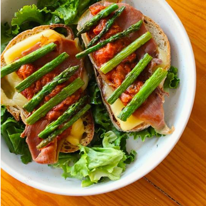 Salsa pomodoro, queso mozzarella, queso Manchego, jamón serrano, espárragos, 2 huevos estrellados, sobre hogaza de pan de masa madre montado sobre cama de espinaca.