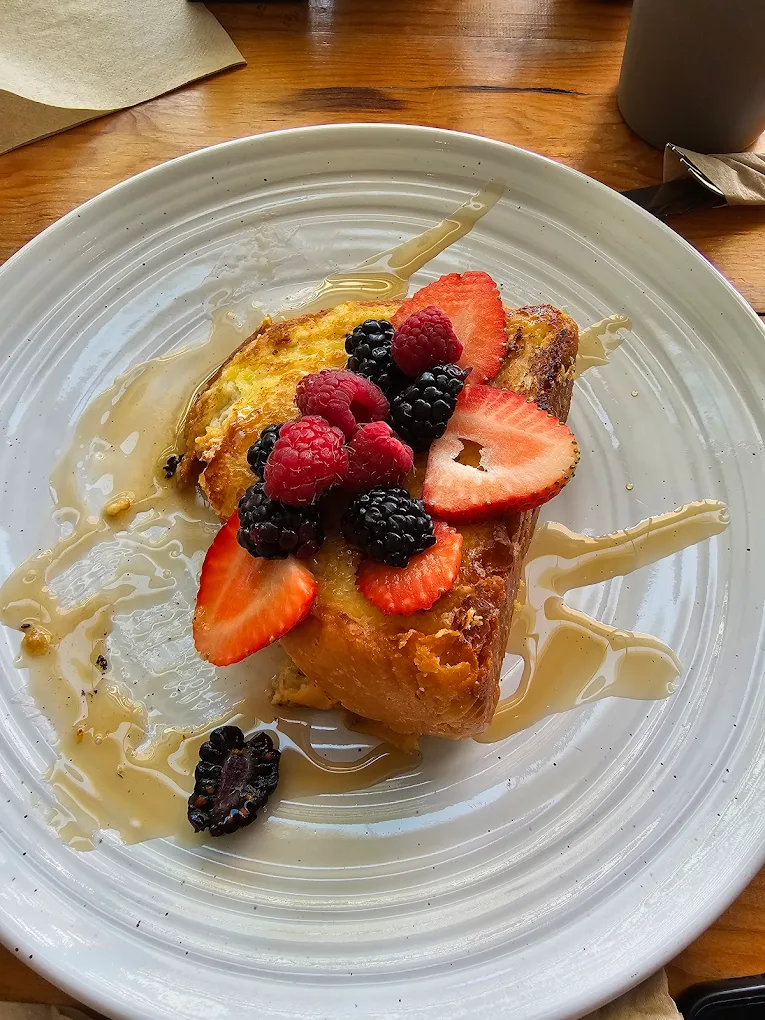 Bañados en glaseado de queso crema, maple y coronado con frutos rojos.